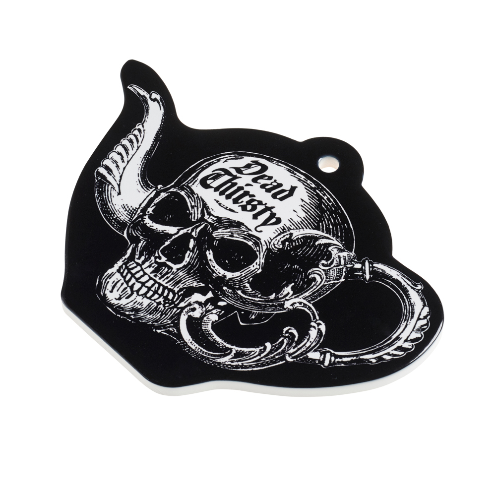 Забавная и функциональная подставка в форме чайника, украшенная изображением черепа, выполненным в стиле барокко и надписью «Смертельная жажда». Мрачное и красивое дополнение к кухне.