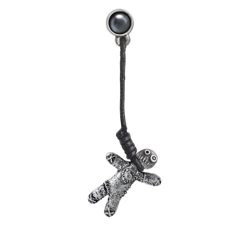 Особенностью серьги является петля с куклой-вуду на конце, которая является символом древней магии и защиты от врагов. Черный вощеный шнурок, входящий в комплект, позволяет носить серьгу на любой длине.