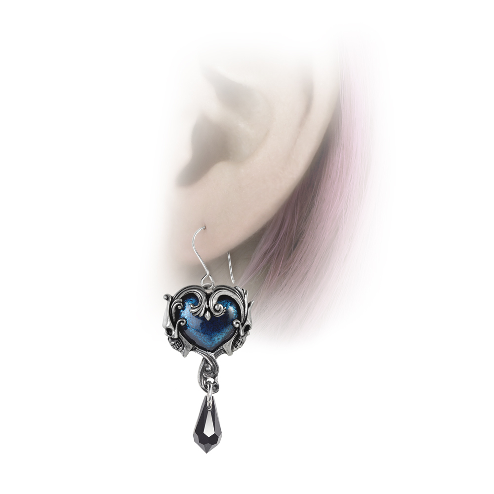 Серьги выполнены в готично-романтическом стиле, что делает их отличным выбором для вечернего свидания или тематической вечеринки. Черепа, украшающие серьги, придают им темную романтику, а сердце из сверкающей полуночной голубой эмали и барочная рама из тонких профилей черепа делают их уникальными.
