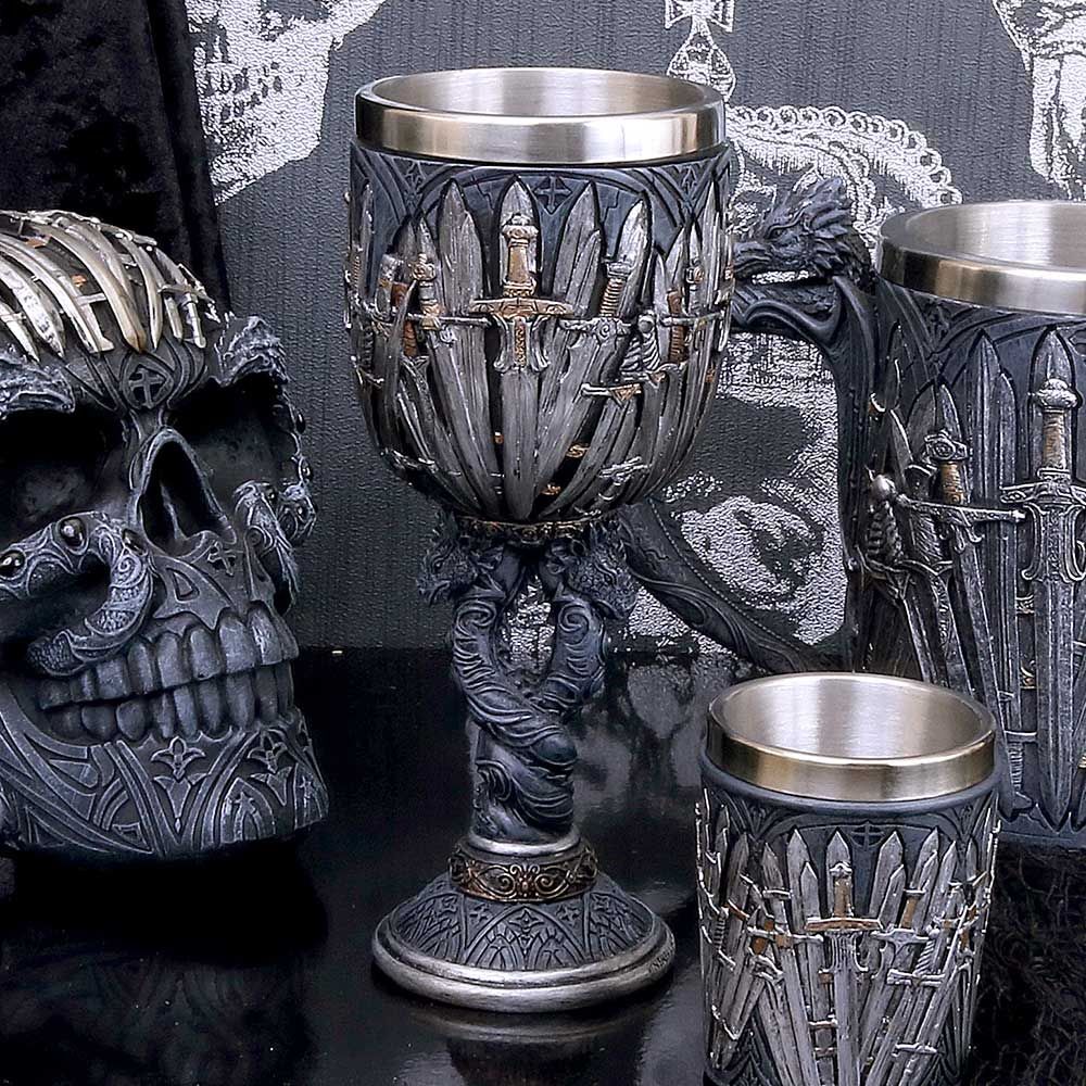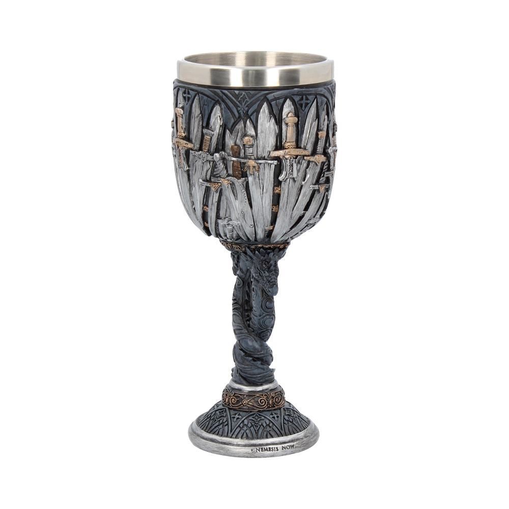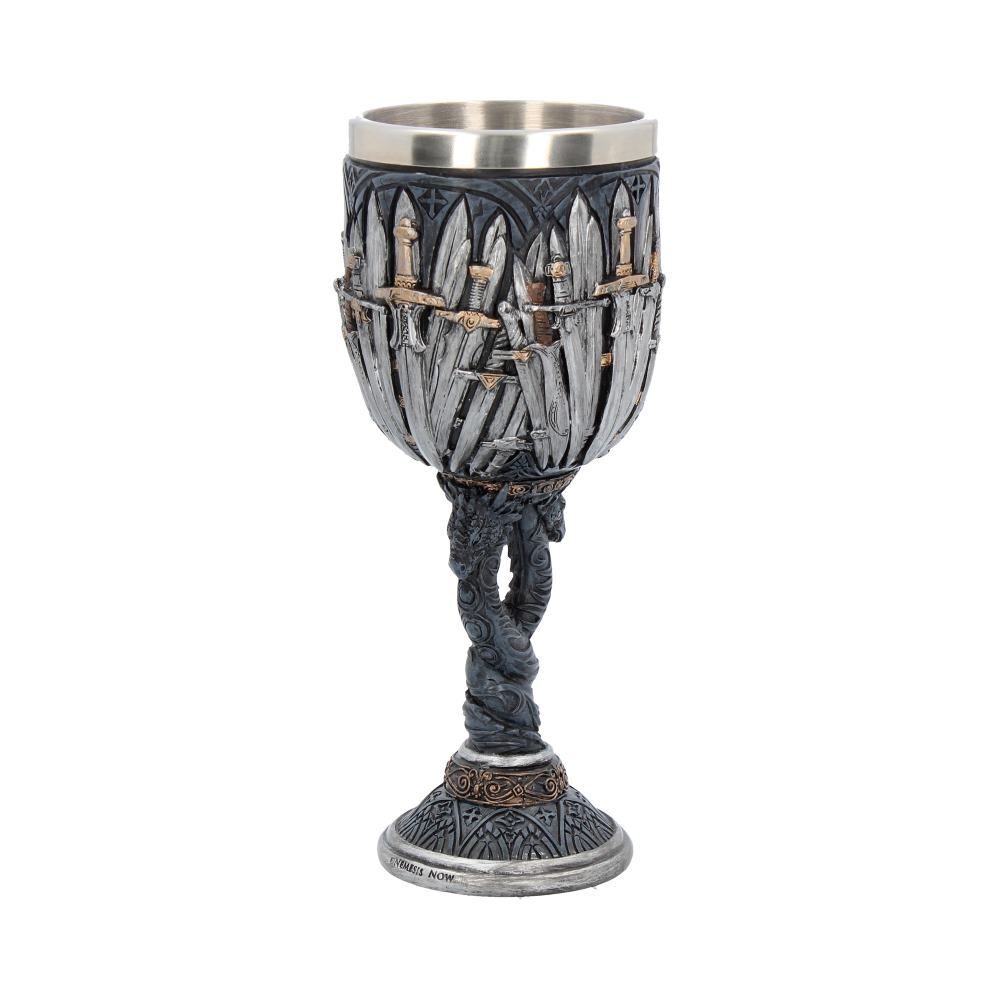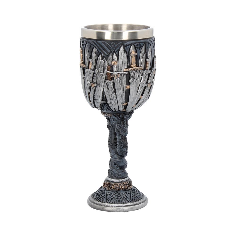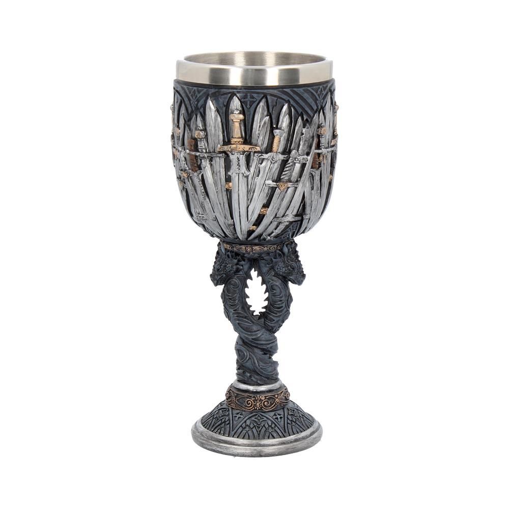 Этот кубок был создан талантливыми дизайнерами бренда Nemesis Now. Ножка этого кубка представляет собой головы двух черных Драконов, их шеи переплетены, головы обращены наружу. Опираясь на них, корпус кубка украшен множеством мечей на черном фоне.