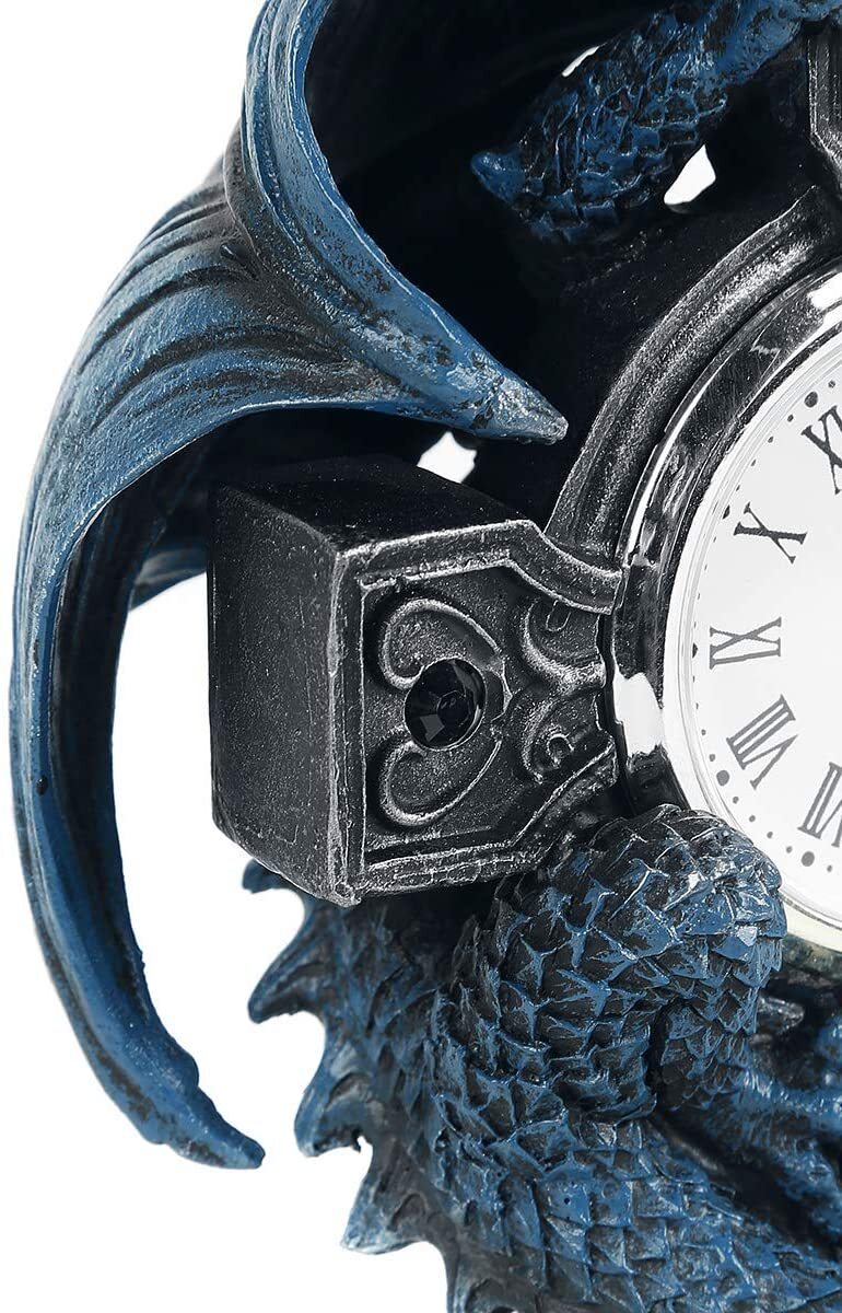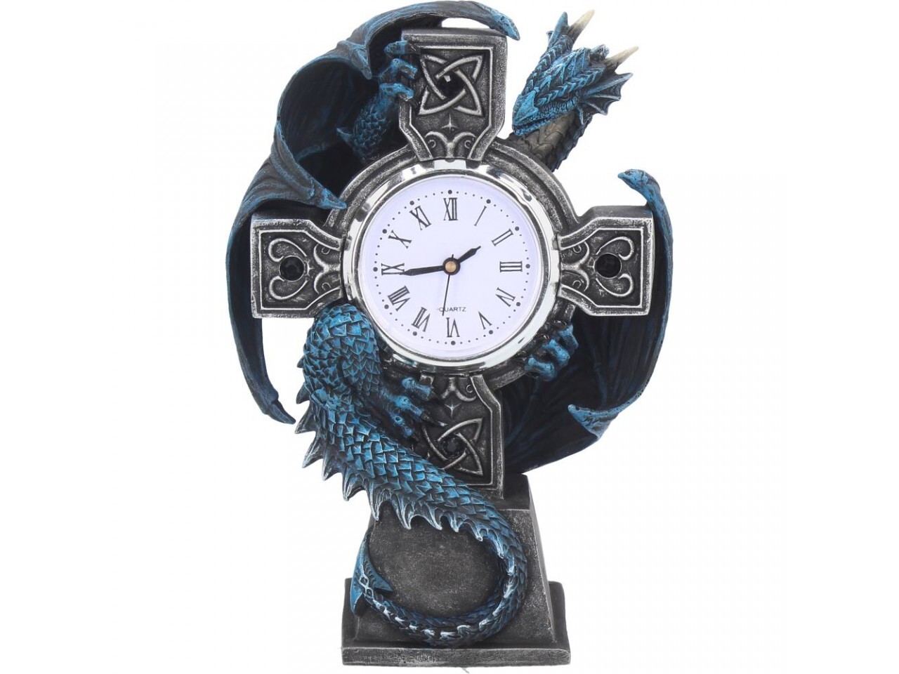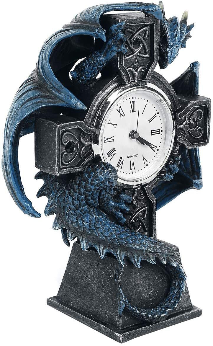 Эти часы "дракон" - плод готического воображения всемирно известной художницы альтернативного фэнтези Анны Стоукс. Эти часы в форме черного кельтского креста с узорами из кельтских узлов, инкрустированных черными драгоценными камнями, обрамляют циферблат. На обратной стороне креста примостился синий дракон с поднятыми крыльями и головой, предупреждающий любого злоумышленника или потенциального вора. Отлитые из тончайшей смолы и тщательно раскрашенные вручную, эти часы являются фантастическим способом охраны вашего самого сокровенного имущества - времени.