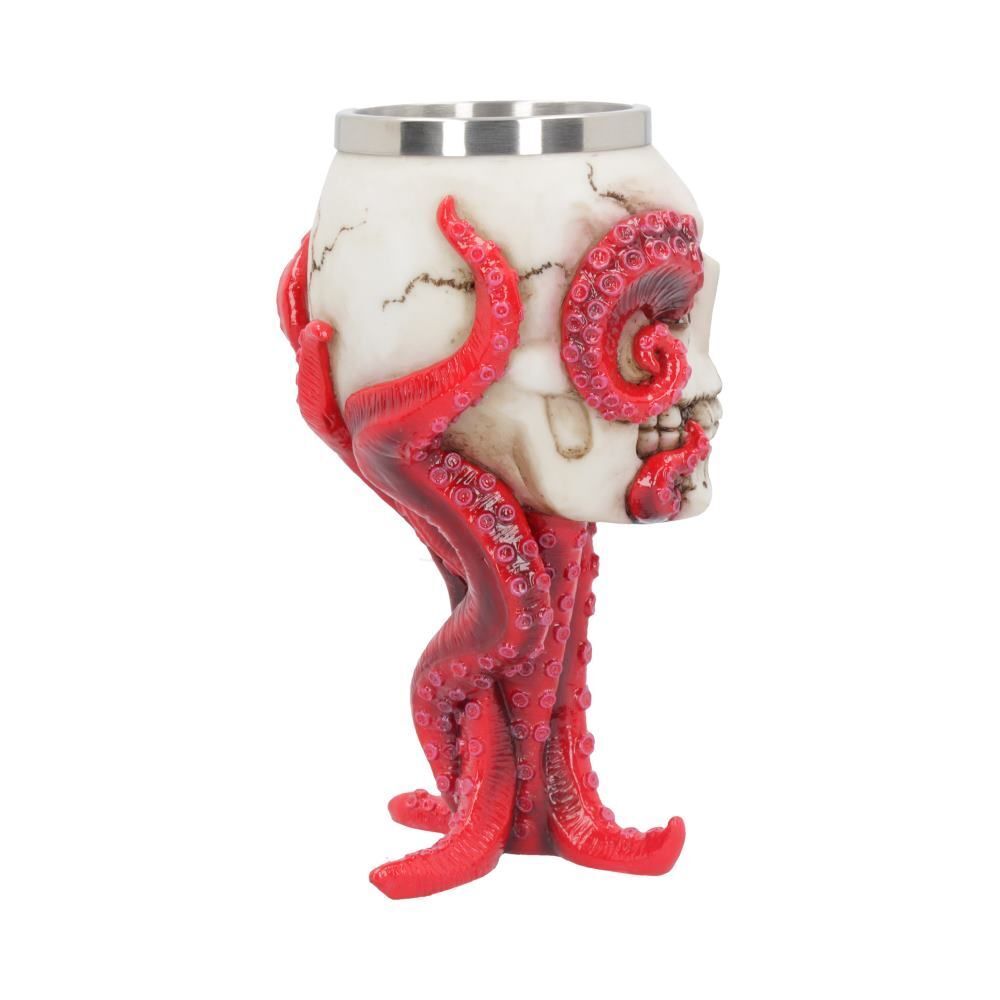 Дизайн этого старинный и причудливого кубка с чашей черепом отсылает нас к творчеству писателя-фантаста Ча́йна Тома Мьевиля и был разработан собственной командой дизайнеров Nemesis Now. Из этого черепа, потрескавшегося и обветренного, вырываются извивающиеся ярко-красные щупальца, выгибающиеся из глазниц и пробивающие отверстия в черепе. Отлитый из тончайшего полистоуна и тщательно раскрашенный вручную, он имеет съемную вставку из нержавеющей стали и станет предметом обсуждений в любом доме. Предназначен для использования по прямому назначению, а так же в декоративных целях. Мыть только вручную. Объем бокала - 200 гр. 18 см.