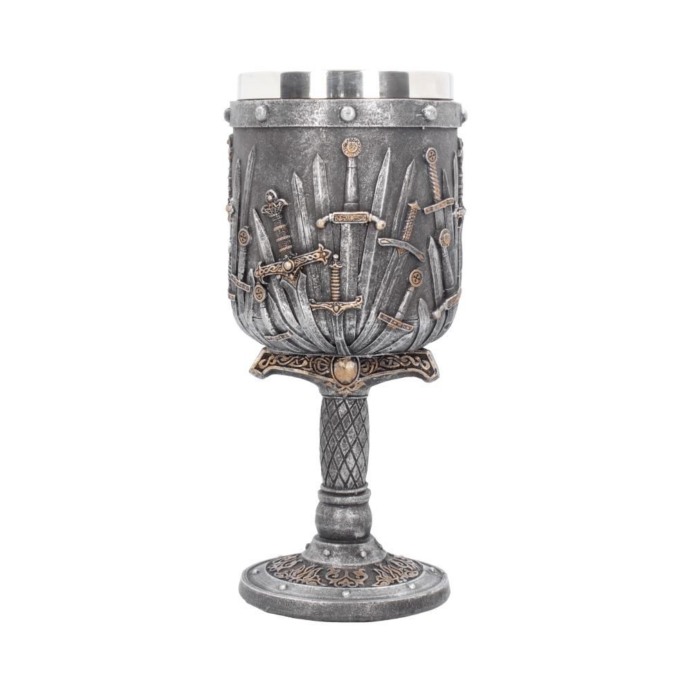 Подарите подарок, достойный короля, с помощью этого удивительного кубка "Меч короля" из коллекции подарочной посуды альтернативного бренда Nemesis Now! Кубок, украшенный мечами с разными рукоятками и лезвиями, стоит на гарде и рукояти большего меча.