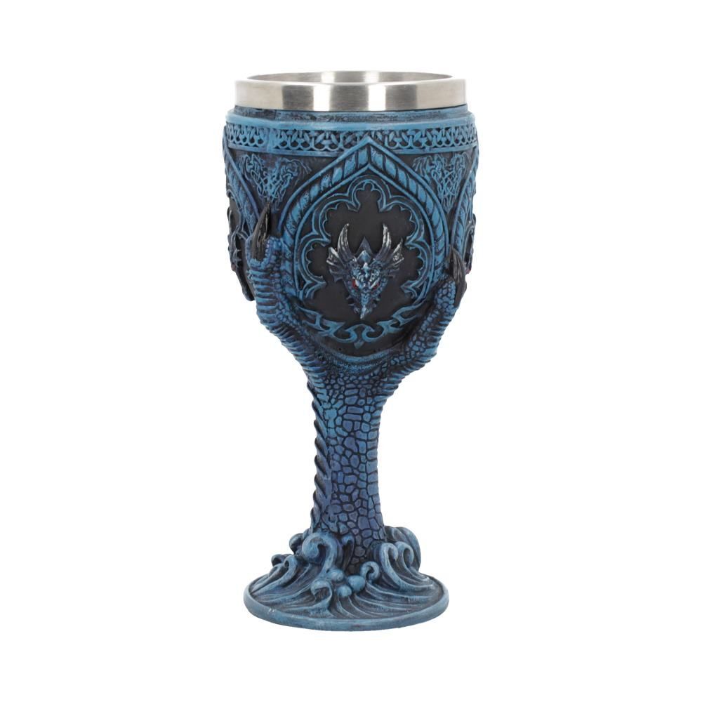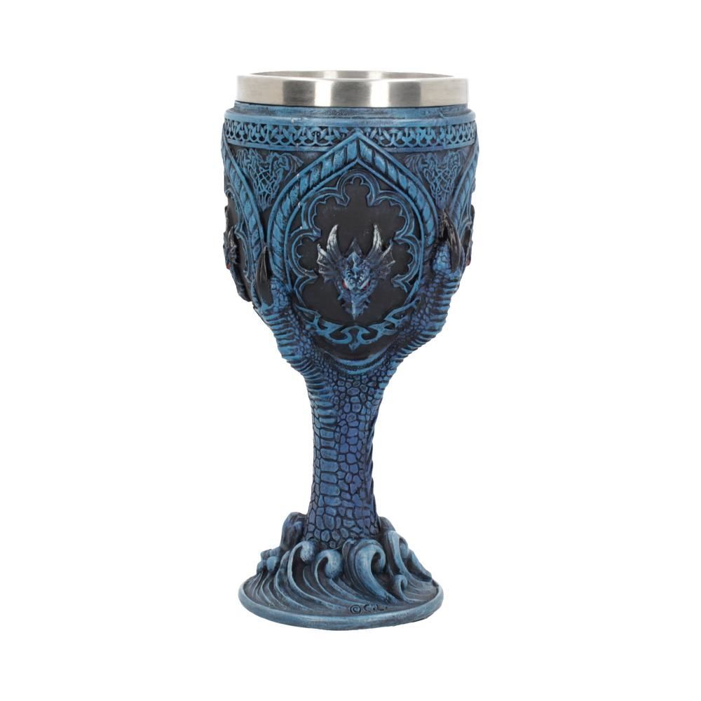 Доступный в коллекции готических подарков Nemesis Now мрачный кубок прекрасно дополнит необычную обстановку дома. Драконья лапа с когтями поднимается от основания кубка и держит чашу. По бокам расположены четыре изображения головы демонического Дракона.