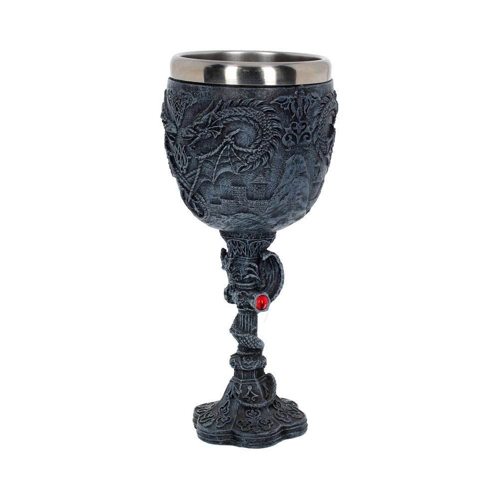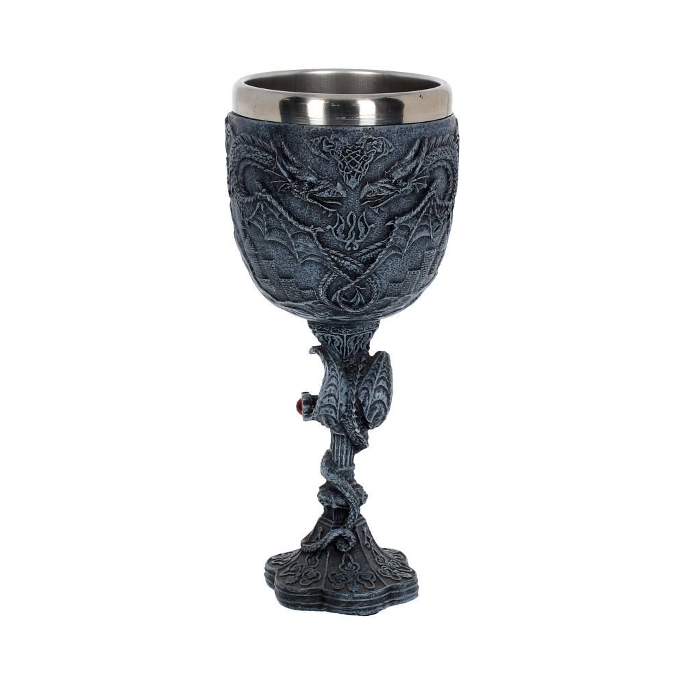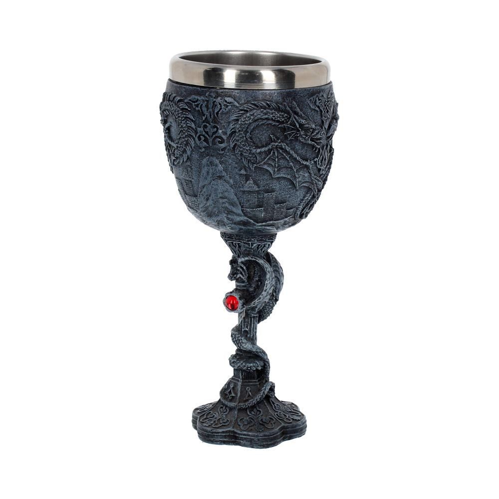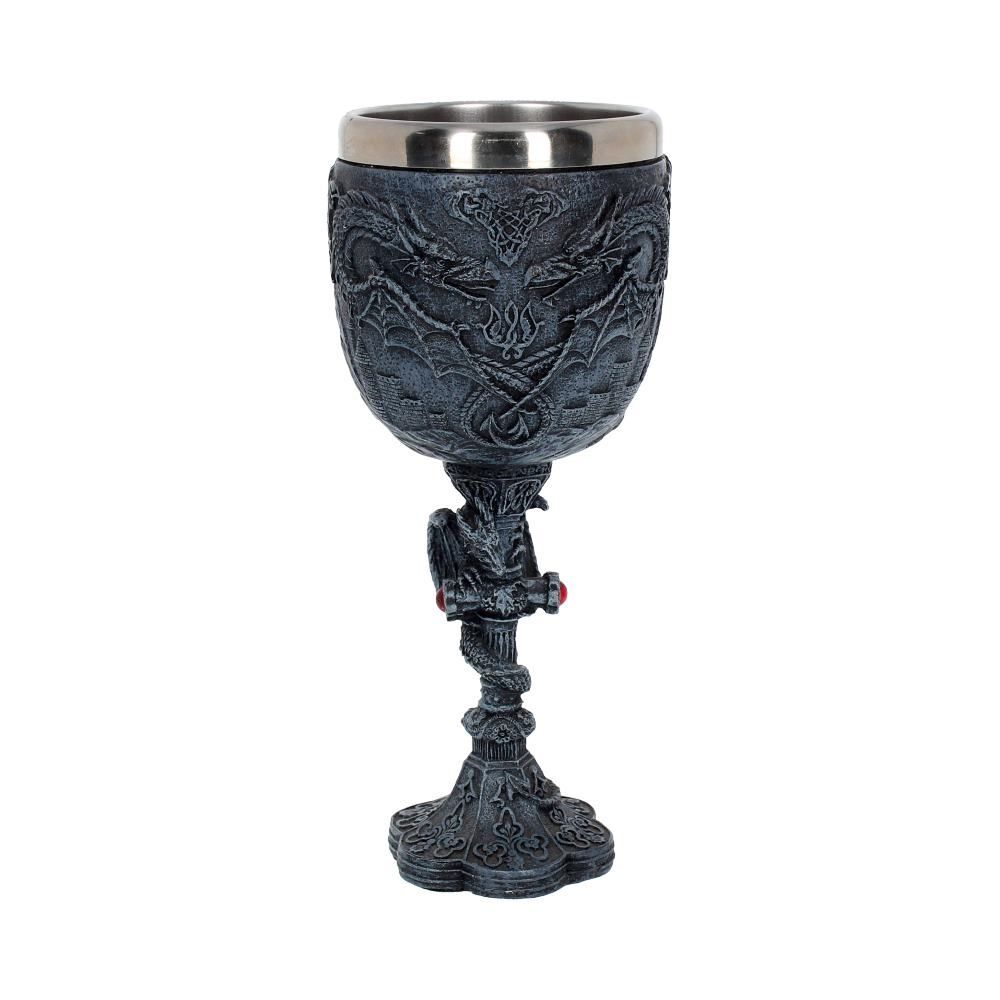 Этот готический кубок с драконом входит в коллекцию подарочной посуды альтернативного бренда Nemesis Now. Кубок украшают 2 больших огнедышащих дракона, напряженно смотрящих друг на друга.