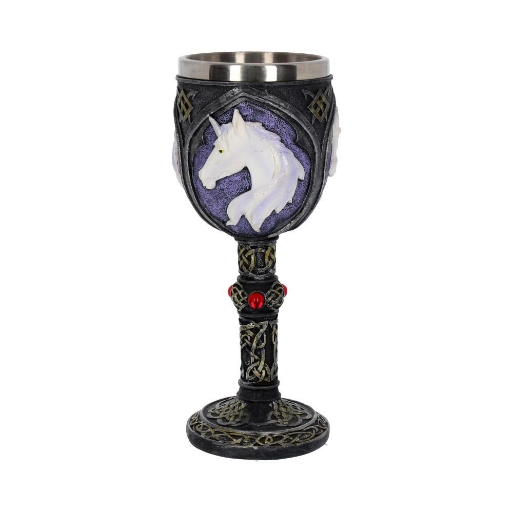Фэнтезийный кубок черного цвета, богато украшенный серебряными узорами, с рубином на ножке. На чаше кубка изображена белая голова Единорога на фиолетовом фоне, этот рисунок идёт вокруг всей чаши.
