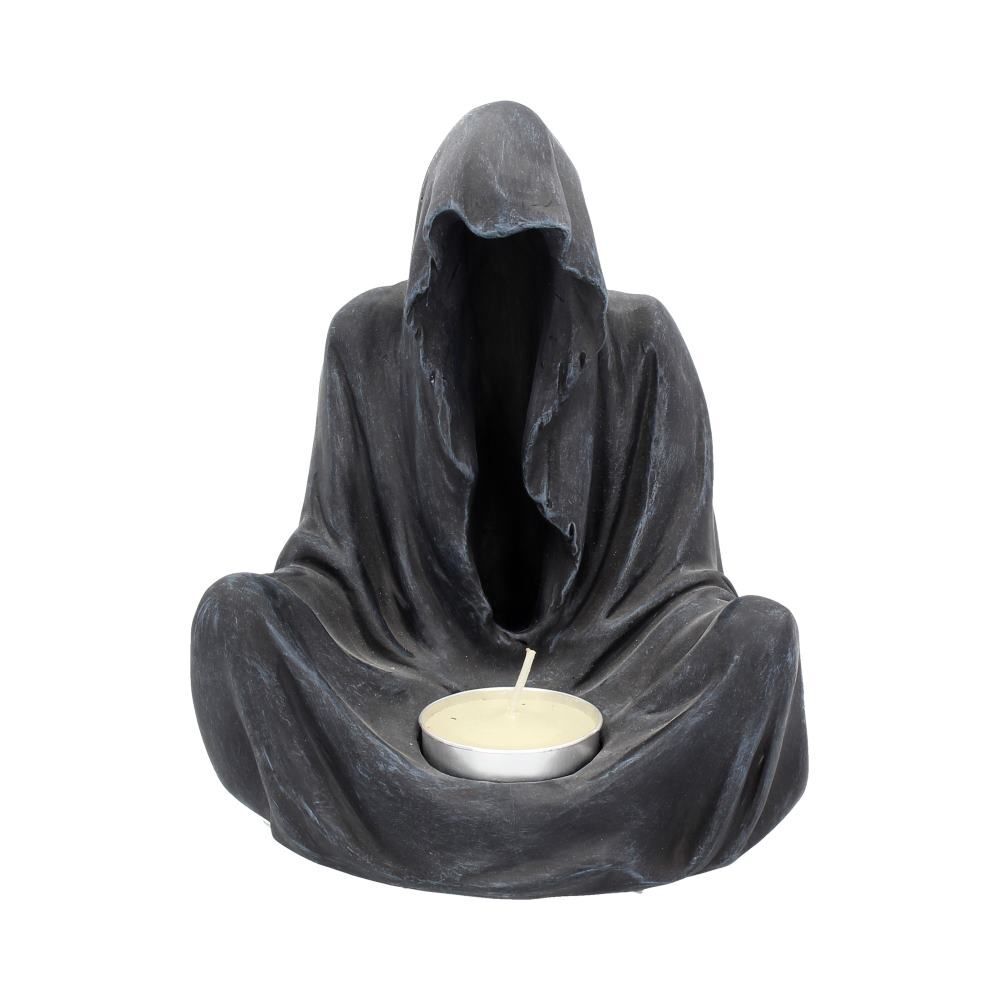 Жнец сел на землю и отдыхает в тишине. Капюшон его черного плаща опущен, скрывая лицо скелета и придавая фигуре зловещую ауру. В основании ставится маленькая свеча.