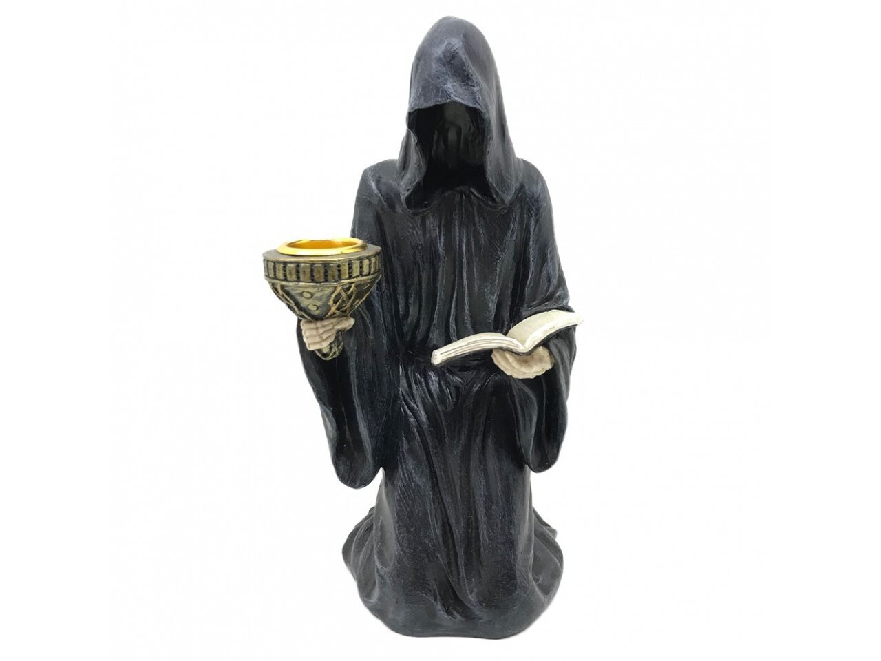 Доступный в коллекции сувениров Nemesis Now's Alator Gothic, этот мрачный подсвечник осветит любой склеп или катакомбы. Стоящая в одиночестве фигура в капюшоне, практически полностью скрытая под мантией, склонила голову, чтобы провести последнюю проповедь. Из рукавов показываются две скелетные руки, левая держит открытую книгу, в правой - золотая курильница, в которую помещается свеча. Отлитый из высококачественной смолы и искусно расписанный вручную, этот подсвечник  добавит таинственности комнате, которую будет освещать. 21 см.
