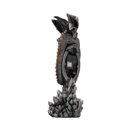 Возьмите под контроль свое время с помощью этих фантастических вертикально стоящих часов из коллекции сувенирной продукции альтернативного бренда Nemesis Now. Возвышаясь из скопления темно-серых кристаллов, часы Clockwork Reign ревностно охраняются часовым драконом, бронзовые зубцы и латунные заклепки сидят на стальной чешуе. Загнув хвост вокруг часов, он рычит на вас, подняв крылья в знак устрашения. Отлитые из высококачественной смолы и тщательно раскрашенные вручную, эти величественные часы могут украсить любую каминную полку. Требуется 1 батарейка типа АА