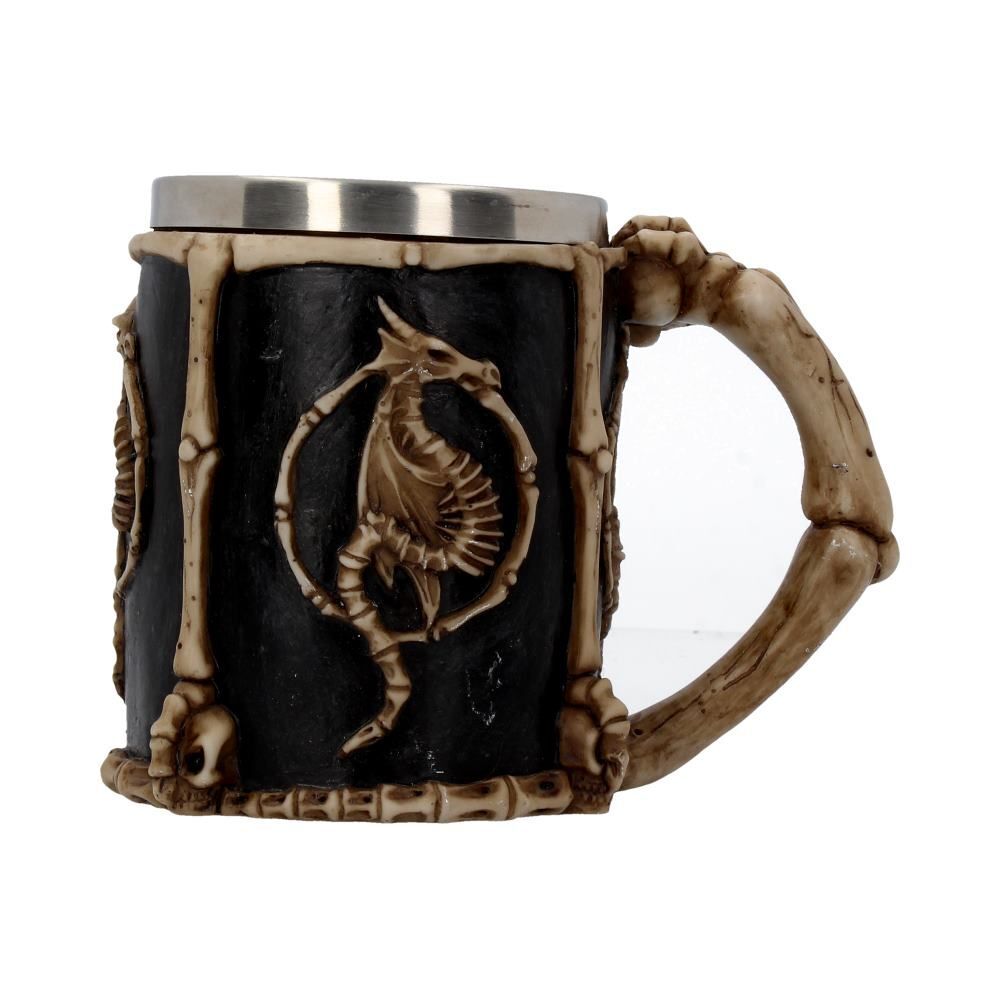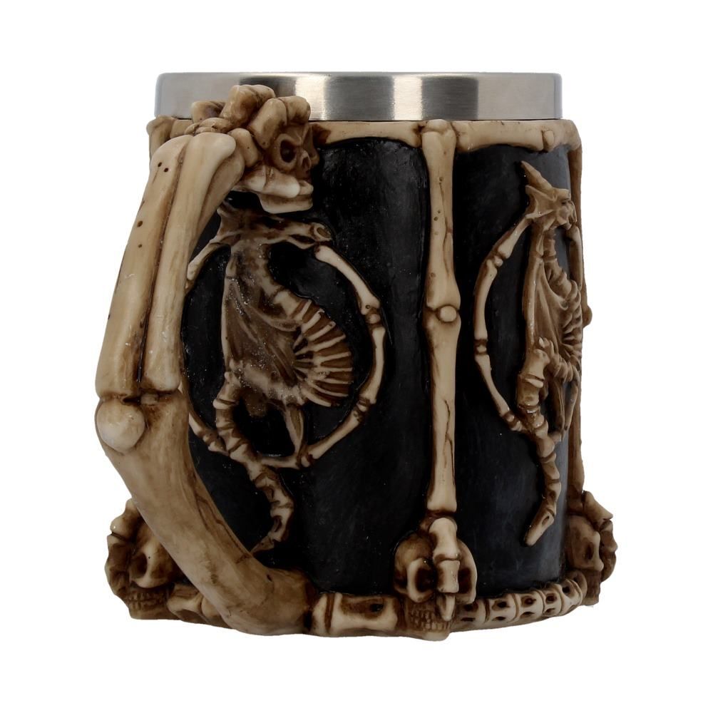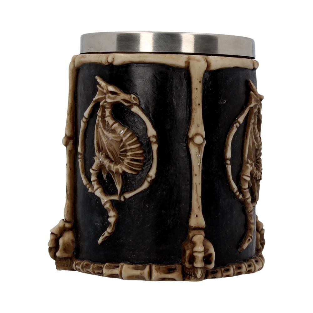 Эта кружка украшена множеством костей мертвых животных и людей! Кости всех типов расположены вокруг основания и обода, а на каждой стороне вырезан костяной знак дракона. Этот танкард с драконьим сигилом расписан вручную и имеет съемную вставку из нержавеющей стали для удобства чистки. Идеальный подарок для любого любителя фэнтези.