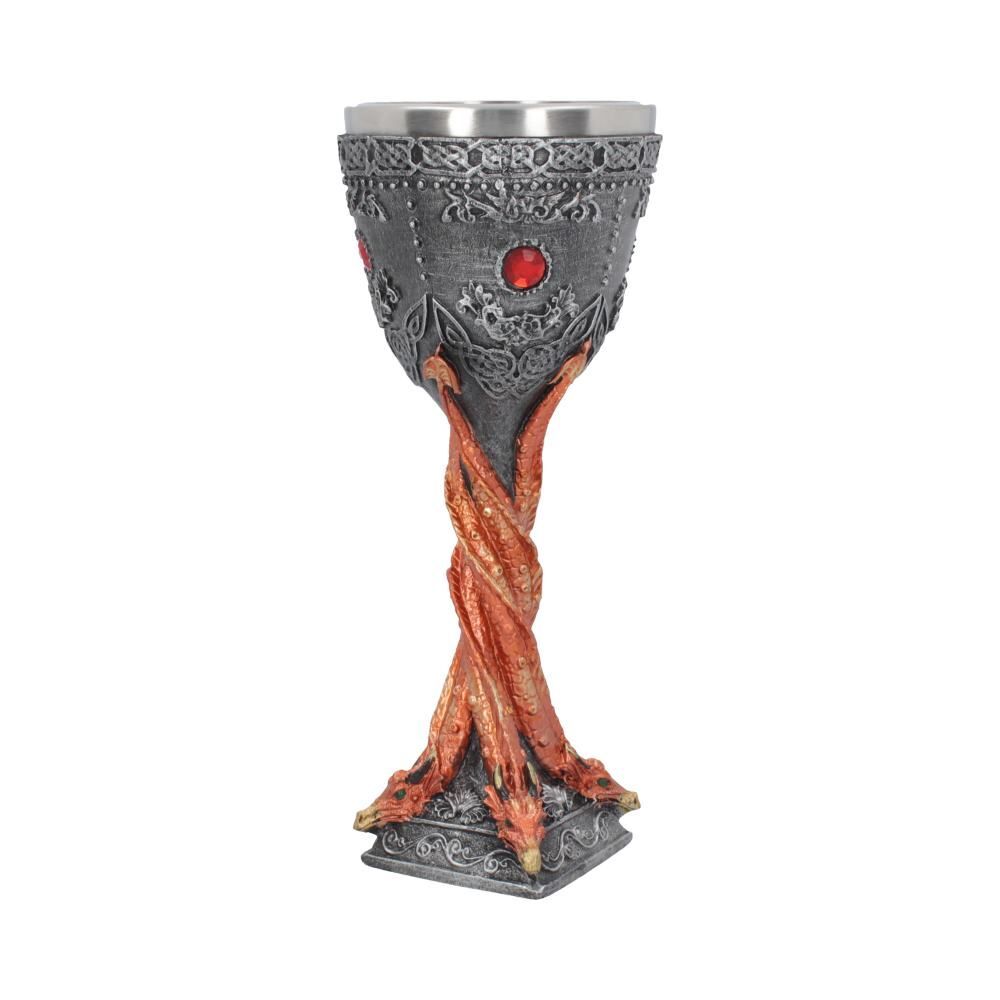Этот кубок был создан талантливыми дизайнерами бренда Nemesis Now. Отлитый из тончайшего полистоуна, а затем тщательно расписанный вручную, этот кубок поставляется со съемной вставкой из нержавеющей стали для удобства очистки. Предназначен для использования по прямому назначению, а так же в декоративных целях. Мыть только вручную. Объем бокала - 200 мл. Этот готический кубок идеально подходит для любого поклонника фэнтези. Основное внимание уделяется ножке, на которой расположены извивающиеся тела четырех янтарных драконов. Их головы лежат на каждом углу квадратного основания, которое украшено замысловатыми узорами из виноградных лоз. Несмотря на относительно простой дизайн, чаша украшена кельтскими узорами и четырьмя красными драгоценными камнями рубинового цвета. 24 см.