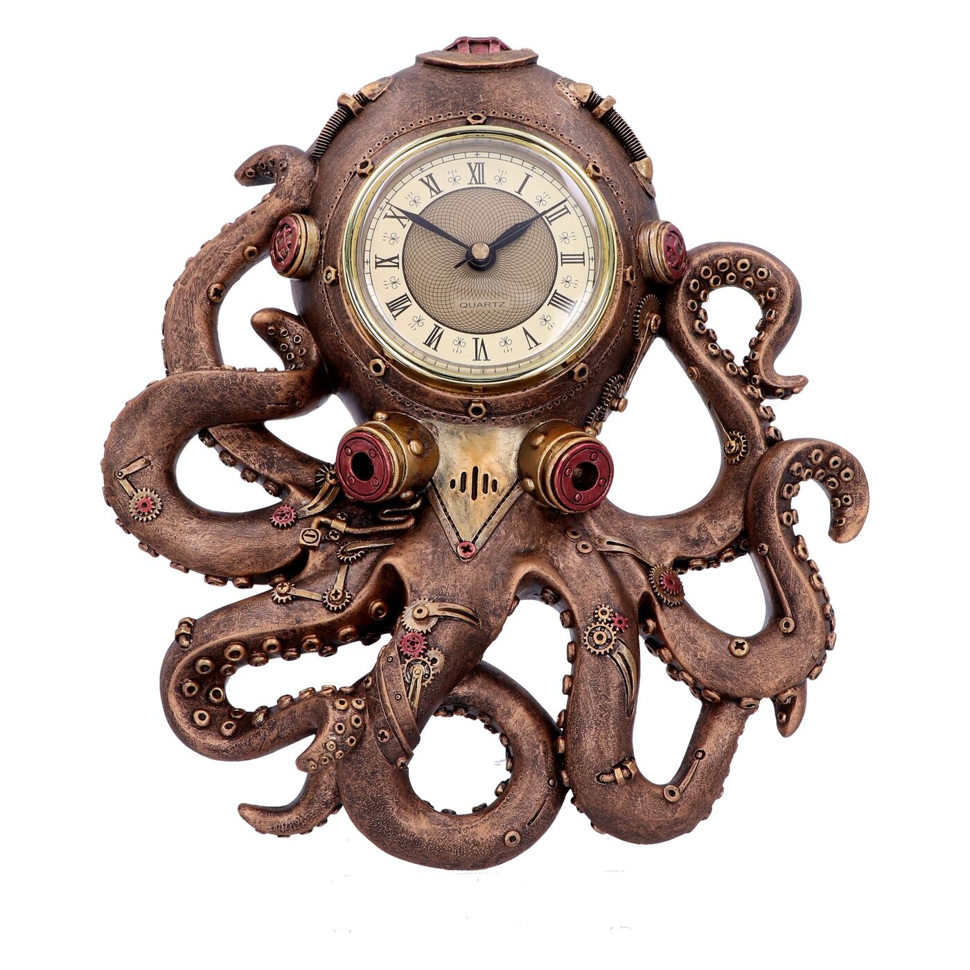 Эти часы в виде осьминога, входят в состав альтернативного ассортимента подарочной продукции Nemesis Now, отлит из высококачественной смолы, а затем покрыт бронзой и с любовью расписан вручную. Сидящая на суше луковичная голова этого осьминога была имплантирована с большим латунным циферблатом, текстурированным заклепками и трубами. Пара латунных очков закрывает два грозных глаза, уставившись не мигая, а маленькие шестерни и винты закрывают его тело. Под ними масса из 8 щупалец крутится и катится в поисках какой-то несчастной жертвы. Эта альтернативная статуэтка, идеально подходящая для любого исследования в стиле стимпанк, - фантастический подарок для любого любителя морской жизни.
