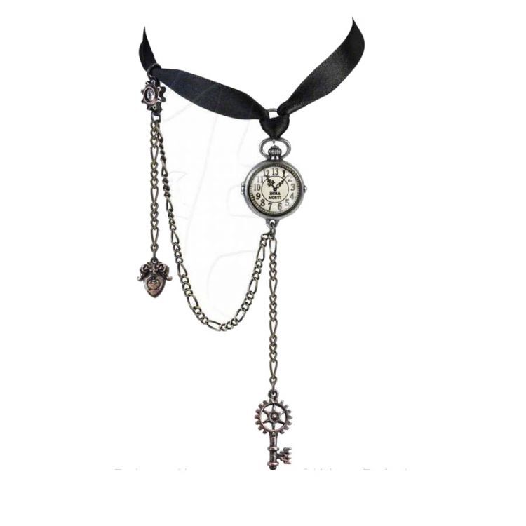 Идеальные миниатюрные 13-часовые часы-чокер с необходимыми аксессуарами викторианской эпохи и надписью "Hora Morti", которые украсят изящную шею утонченной стимпанк-хозяйки.