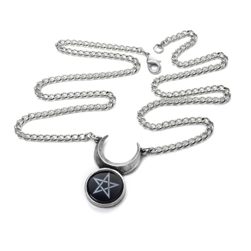 Подвеска выполнена в винтажном стиле и украшена полумесяцем и диском из черного оникса. На диске выгравирована викканская пентаграмма, что придает украшению особый шарм.