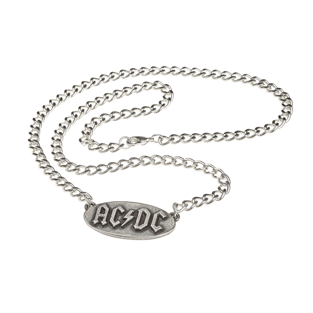 Подвеска логотип AC/DC: logo tag. Навеянный обложкой альбома AC/DC "Let There Be Rock" 1977 года и спроектированный Gerard Huerta, этот логотип с молниями в стиле Гутенберга впоследствии стал постоянным символом группы. Классический логотип AC/DC 1977 года, из старинного английского пьютера, на 31-дюймовой цепи с застежкой.