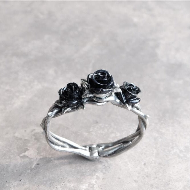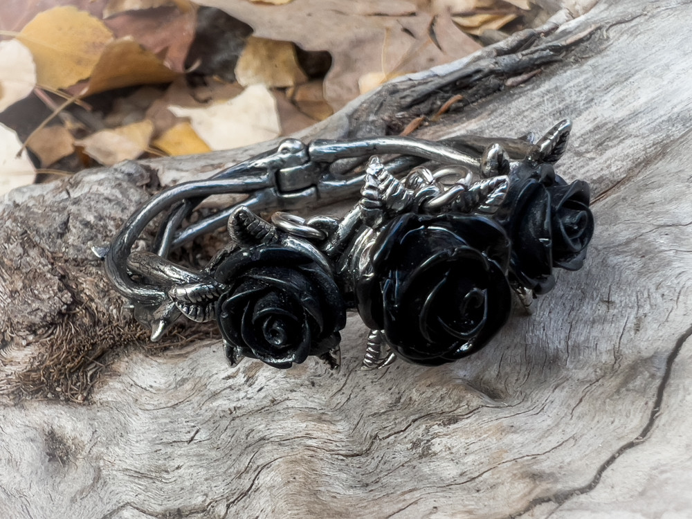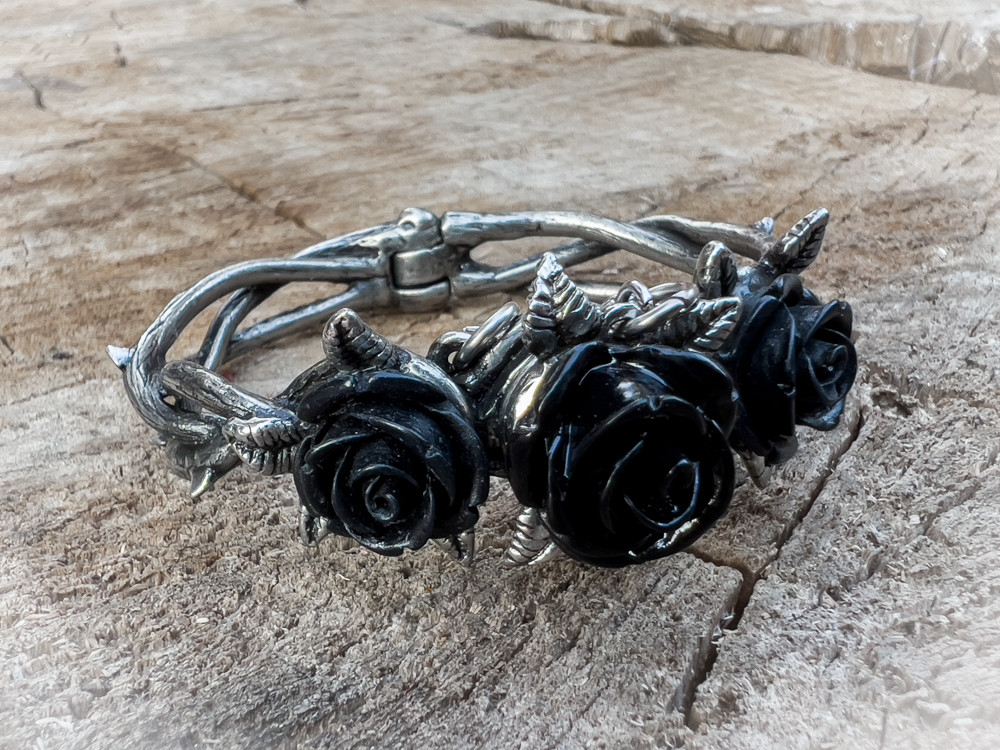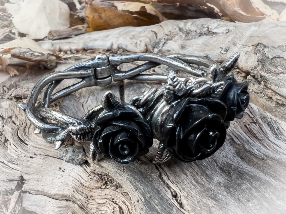 Шарнирный оловянный браслет с витыми шипами роз, на передней стороне которого изображены три черные смоляные розы. Центральная роза (прикрепленная к короткой предохранительной цепочке) образует запирающее устройство с сильным магнитом; просто расстегните, вытащив центральную розу из магнитного замка.