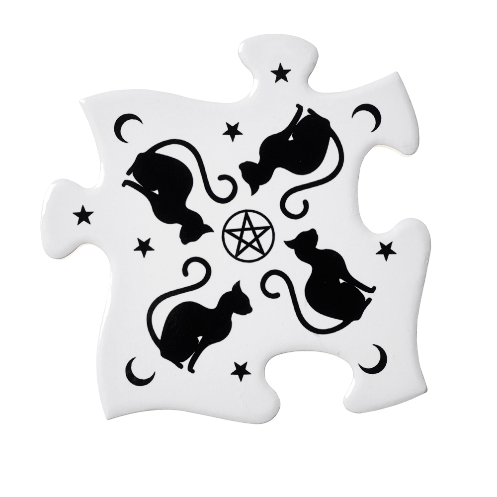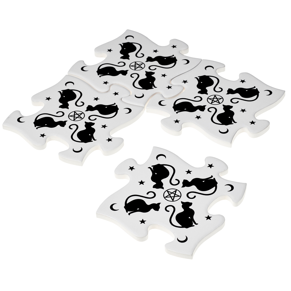Черные кошки, пентаграммы, звезды и полумесяцы служат украшением этого изумительного набора из 4 подставок для чашек.