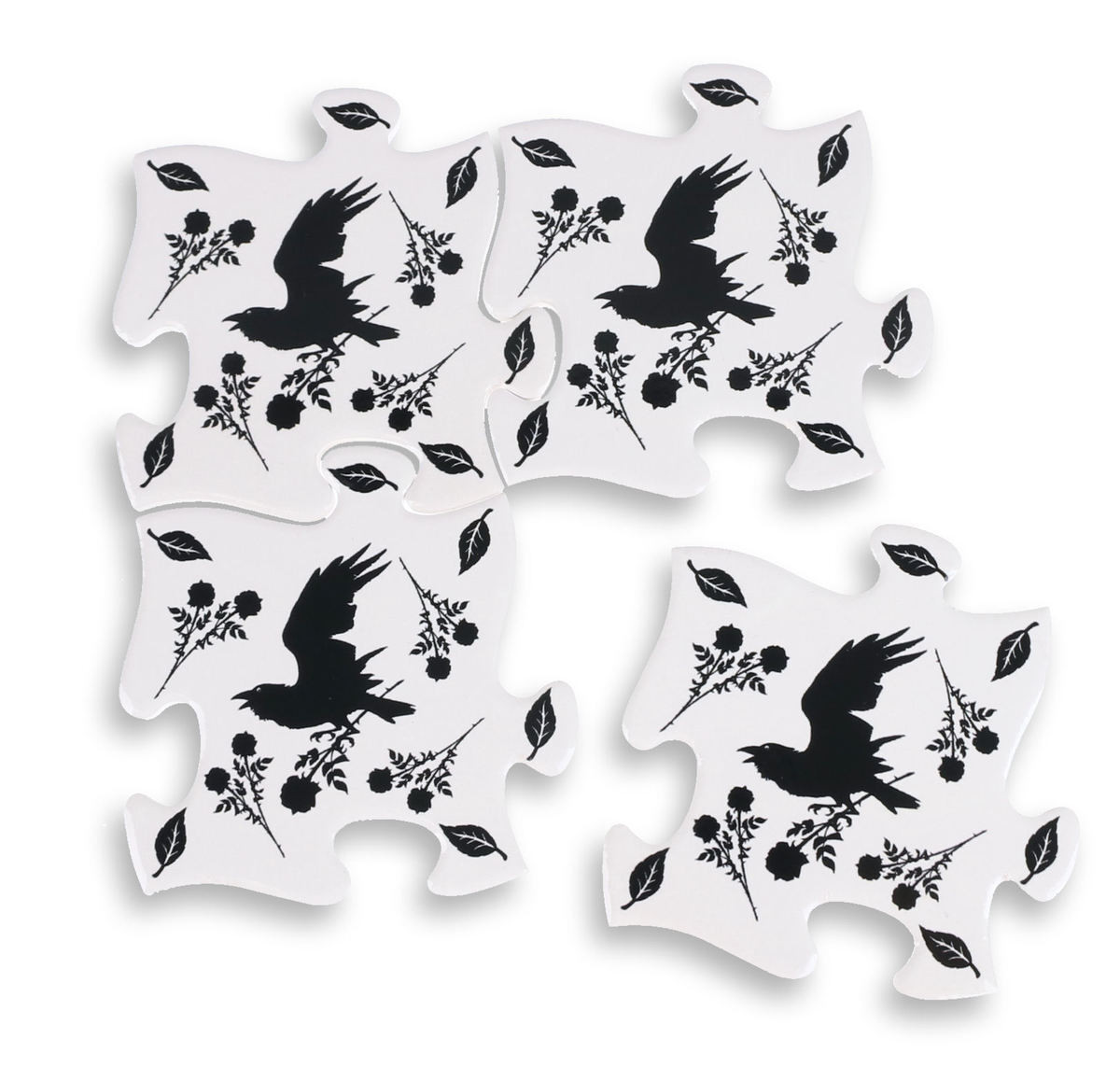 Прекрасный набор из четырех подставок-пазлов, украшенный изящным алхимическим рисунком, изображающим ворона и розу. Набор станет прекрасным украшением вашего дома.