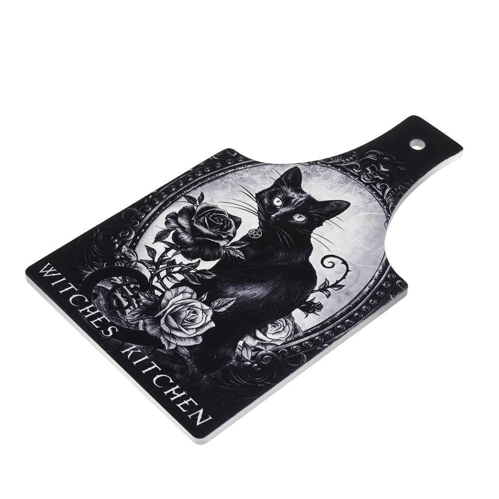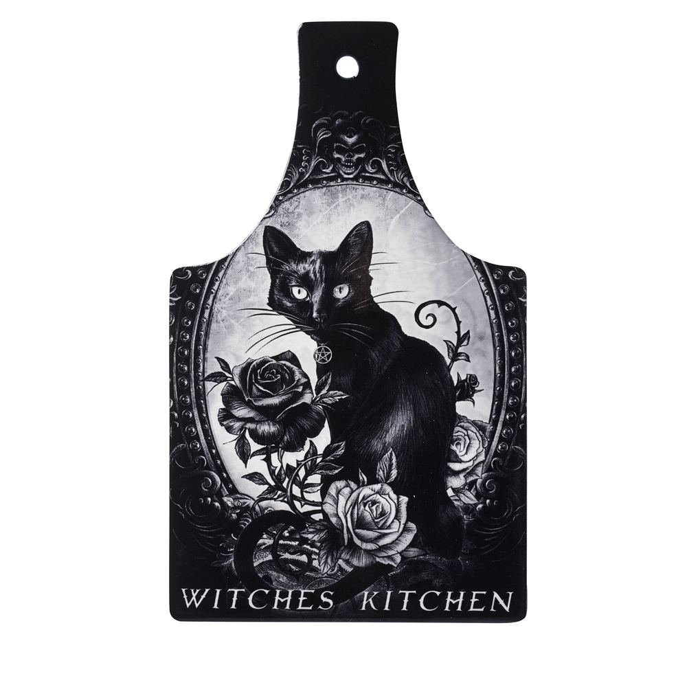 На этой кухонной доске / сервировочной подставке 'Ведьмина кухня' представлен мрачно-прекрасный арт с черной кошкой. Поставь эту красоту рядом со своим кипящим котлом, и тебе будут завидовать ведьмы на многие мили от тебя!