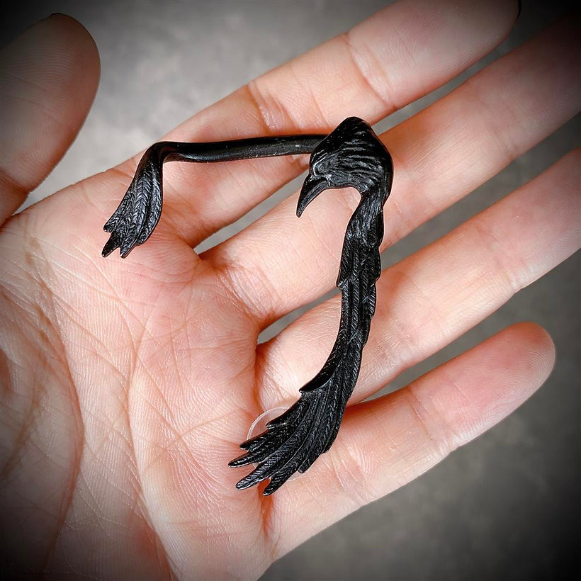 Подобно личному наставнику, готовому передать свой сверхъестественный интеллект своему хозяину и вызывающему сверхъестественные силы защиты, черный ворон обнимает ухо своего хозяина. Черные крылья и голова ворона выглядывают из-за левого уха. Крепится к нижней части уха гвоздиком из хирургической стали, а верхнее крыло можно регулировать путем мягкого сжимания по размеру. Вес и размеры: H: 56 мм (2,20") W: 39 мм (1,54") D: 15 мм (0,59") Вес: 13 г (0,46 унции).