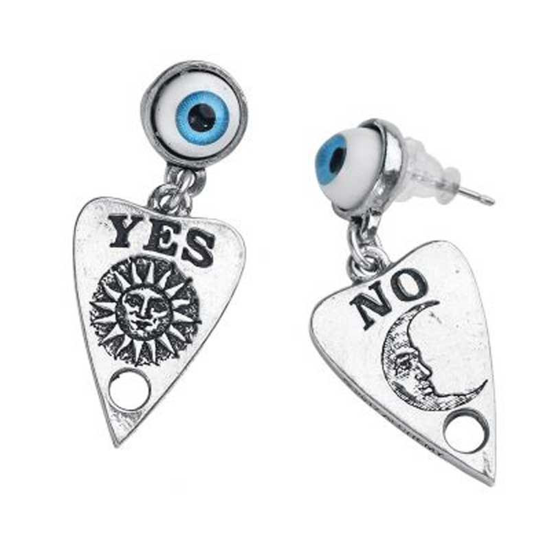 Пара сережек-планшетов (спиритических указателей) из пьютера с гравировкой «Да» на одной стороне и «Нет» на другой, подвешенных на гвоздиках из хирургической стали с реалистичными акриловыми глазами