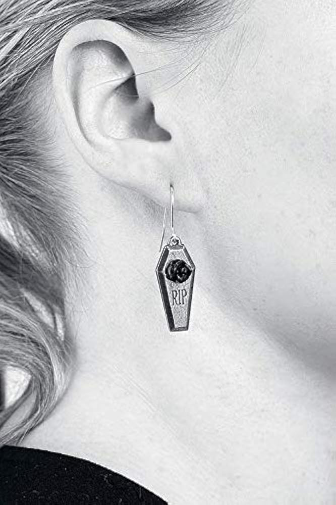 Серьги-подвески "Роза Упокоения" от Alchemy Gothic - это уникальное украшение, которое сочетает в себе готическую эстетику и темную страсть. Эти серьги представляют собой крышку гроба с выгравированной надписью "RIP" и украшены цветком розы, что придает им особый шарм.