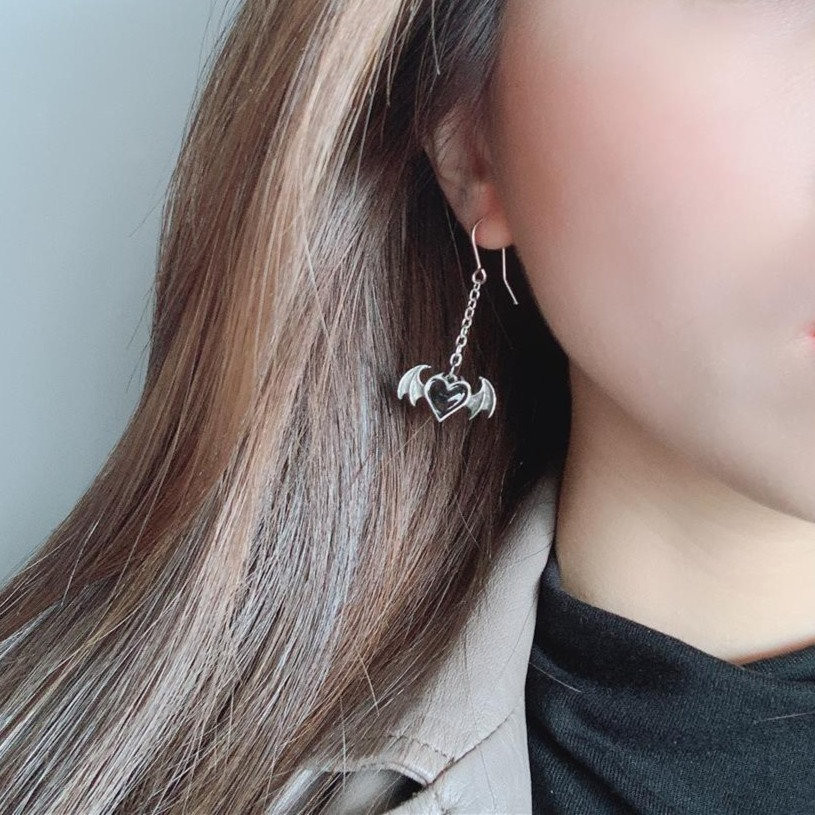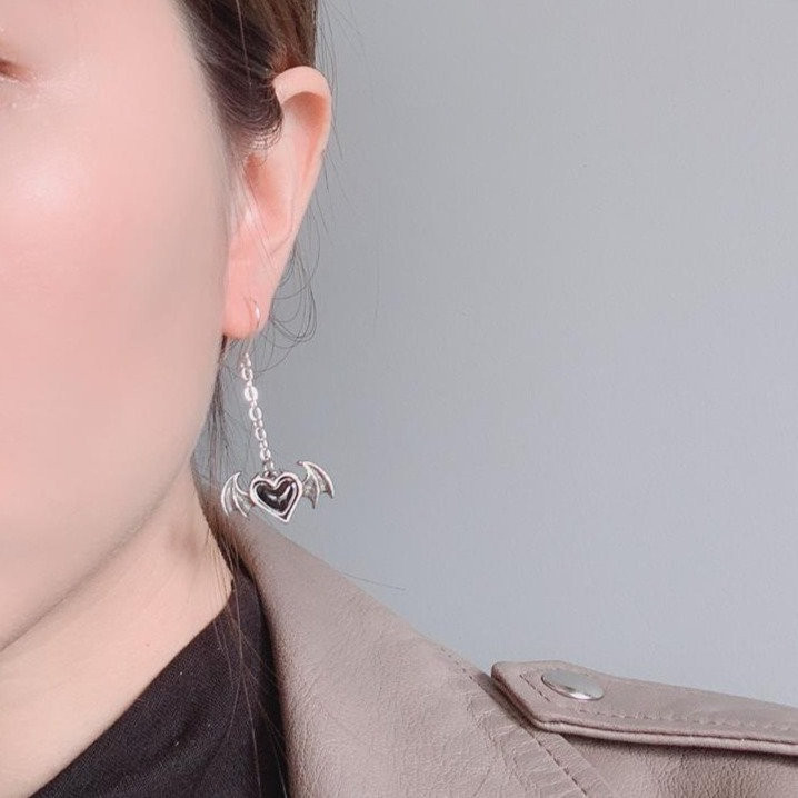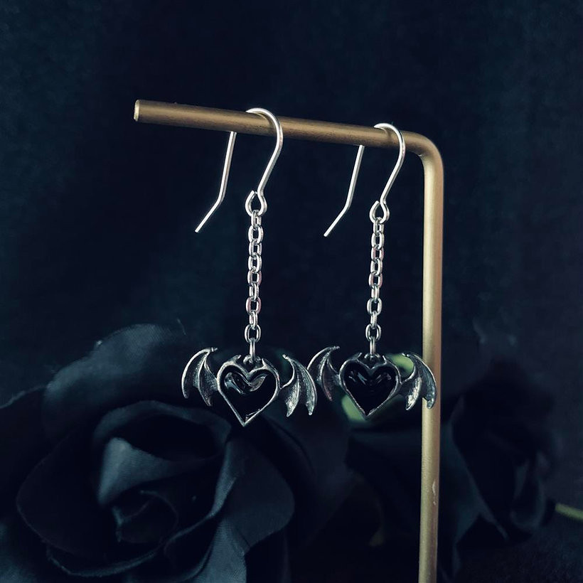 Серьги в форме сердца. Черное демоническое сердце готической искусительницы, по ночам заманивающей к себе свою добычу с помощью чарующих средств. Миниатюрная пара винтажных сережек в форме сердечек покрытых черной эмалью и украшенных крыльями летучей мыши.