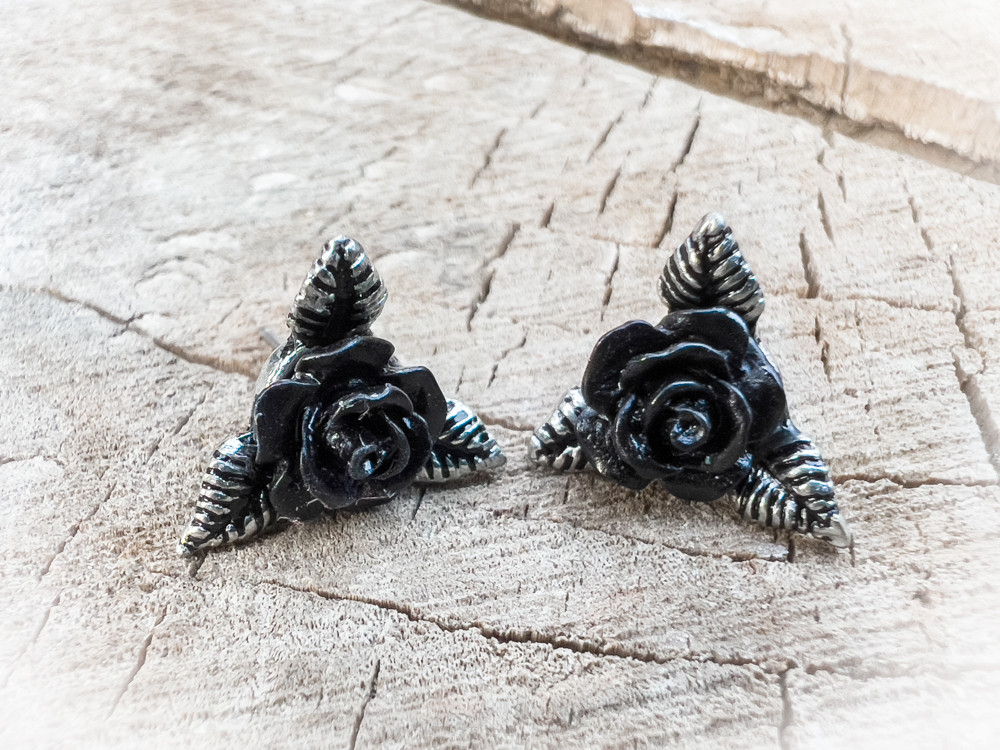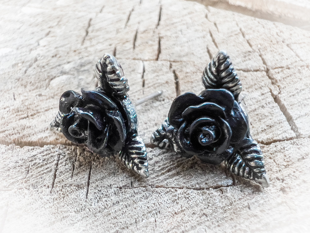 Цветок, сорванный с религиозного венка из черных роз, символизирующий темную и таинственную любовь. Пара серёжек с черной розой в центре. Вес и размеры: H: 15 мм (0,59 дюйма) W: 15 мм (0,59 дюйма) D: 23 мм (0,91 дюйма) Вес: 6 г (0,21 унции).