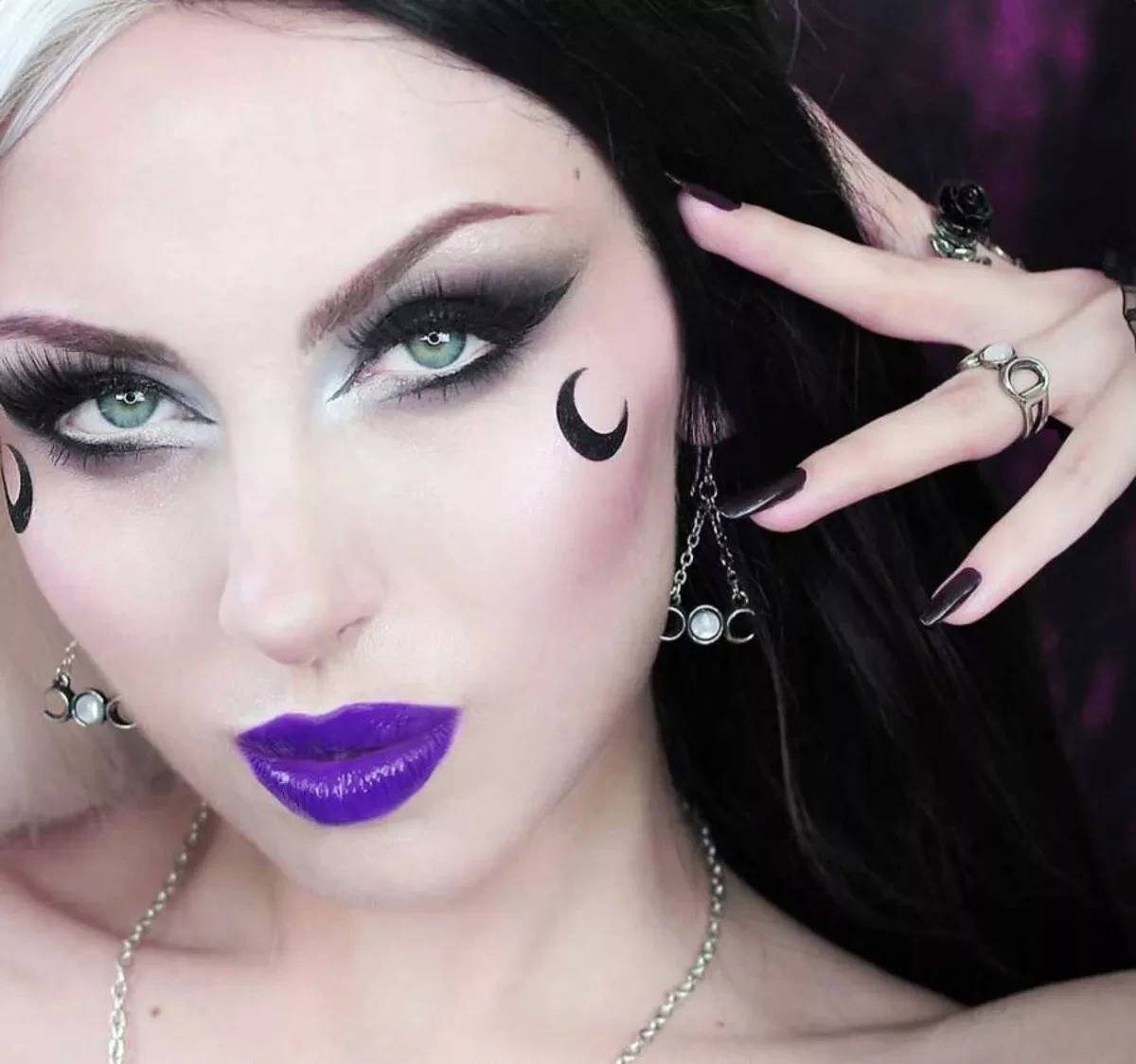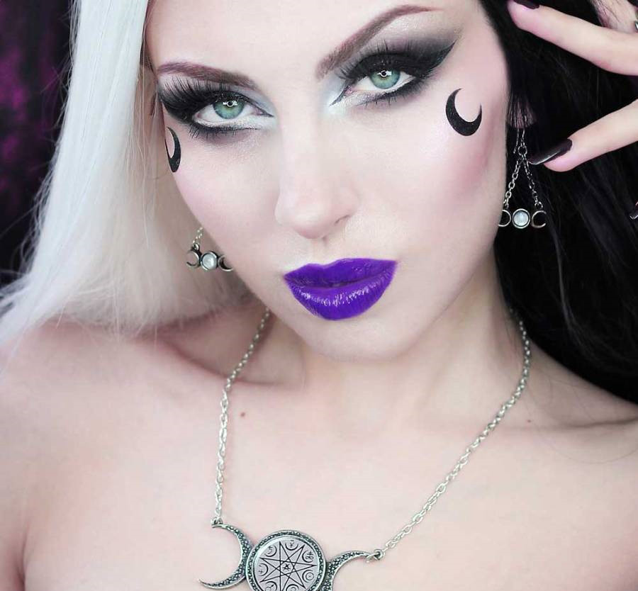 Жемчужная полная луна, обрамленная растущим и убывающим полумесяцами, символизирует тройную богиню викки - Деву, Мать и Старицу, призывающую, помимо прочих атрибутов, исцеление, оккультную защиту, совершенство и богатство.