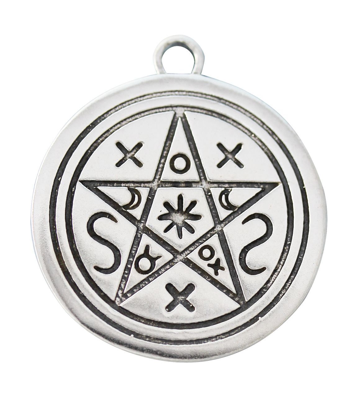 Талисманы этой коллекции передают магическую силу колдовских знаков, тем самым поддерживая своего владельца в его планах: Пентаграмма теней показывает тайные и священные символы колдовства, заключенные в серебряный диск силы и чудес. Таким образом, это украшение хранит старые тайны магии и колдовства. Согласно старинному поверью, эта пентаграмма связывает своего владельца с силами земли и разума и делает его мечты реальностью. Размер изделия: 2,5см Не вреди никому, делай что хочешь, используй заклинания и магические искусства с умом, чтобы принести пользу себе и другим. Амулеты из серии Sigil of the Craft - мощные символы мастерства ведьм и колдунов, заряжают энергией и усиливают магические намерения своего владельца. Каждый амулет серии Sigil of the Craft изготовлен из пьютера, изготовлен вручную и поставляется с кожаным шнурком.