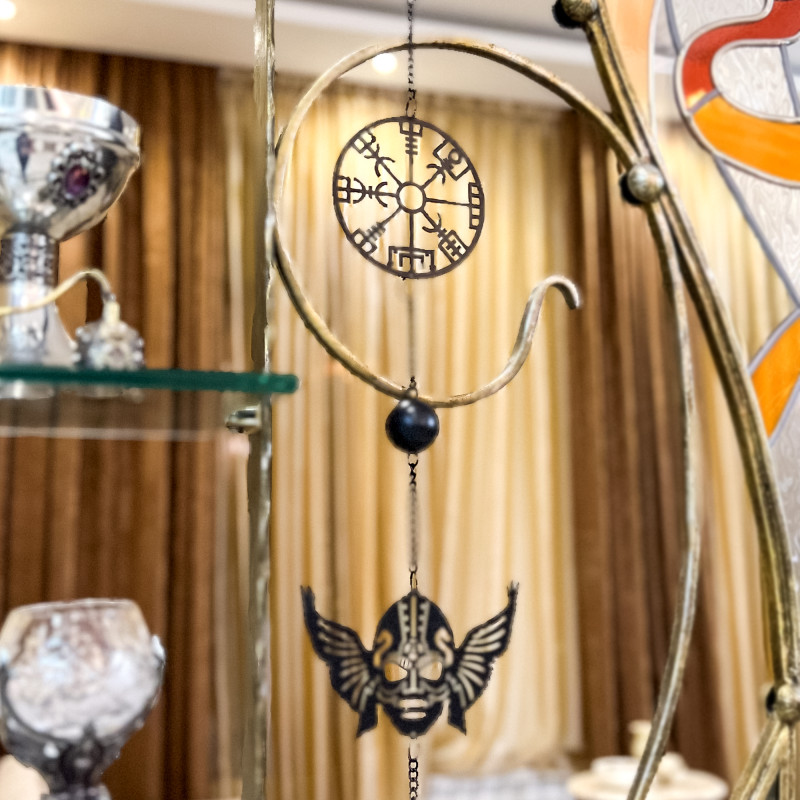 Погрузитесь в атмосферу древних скандинавских мифов с подвесным украшением «Викинг» от компании Alchemy. Этот ветряной колокольчик, украшенный руническими аббревиатурами девяти царств мира викингов, станет не только стильным элементом декора, но и символом богатой культуры и истории скандинавских народов. Придайте своему дому уникальный стиль и атмосферу, вдохновленную мифами и легендами.