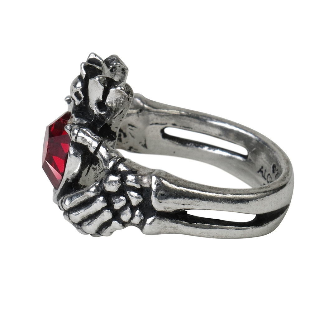 Согласно древней ирландской традиции, любовь, дружба и верность даруются из подземного мира. Кольцо с изображением готической версии ирландского Кладдаха; две скелетообразные руки охватывают палец и держат красное австрийское хрустальное сердце, увенчанное короной с крошечным черепом. Приблизительные размеры: Высота: 18 мм Ширина: 26 мм Глубина: 29 мм. Материалы: Тонкий английский пьютер с австрийским кристаллом в виде сердца.