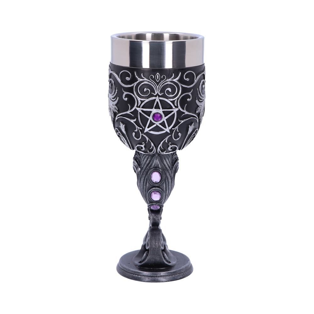 Когда я смотрю в твои глаза, я вижу обещание любви" Украшенный сложными серебряными барочными деталями, поднимающимися от металлического основания к ободку из нержавеющей стали, этот кубок станет прекрасным дополнением к любой завораживающей коллекции. В центре тщательно вылепленной ножки находится голова фиолетового черноглазого кота, выступающая наружу. Над ней - пентаграмма, в сердце - фиолетовый драгоценный камень. Отлитые из высококачественного полистоуна и тщательно расписанные вручную, эти кубки Hex of the Heart могут быть соединены вместе, чтобы сформировать форму сердца, идеальную для того, чтобы разделить с вашей мистической любовью. Предназначен для использования по прямому назначению, а так же в декоративных целях. Мыть только вручную. Объем бокала - 200 гр. 18 см.