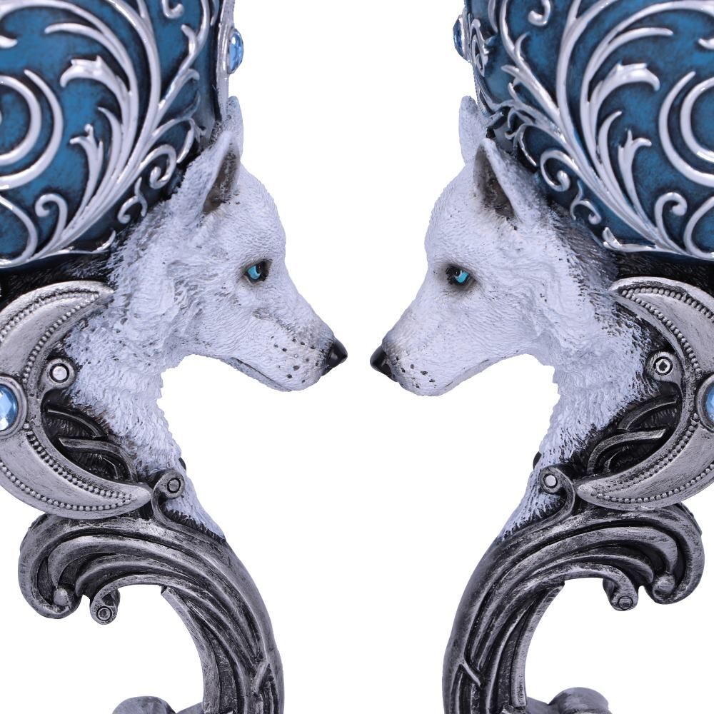 Когда я смотрю в твои глаза, я вижу обещание любви. Украшенный сложными серебряными барочными деталями, поднимающимися от металлического основания к ободку из нержавеющей стали, этот кубок станет прекрасным дополнением к любой коллекции дикой природы. В центре тщательно вылепленной ножки находится голова голубоглазого зимнего волка, выступающая наружу. Над ней - полумесяц, а в сердце - голубой драгоценный камень. Отлитые из высококачественного полистоуна и тщательно расписанные вручную, эти кубки Wild at Heart могут быть соединены вместе, чтобы сформировать форму сердца, идеальную для того, чтобы разделить с вашей мистической любовью. Предназначен для использования по прямому назначению, а так же в декоративных целях. Мыть только вручную. Объем бокала - 200 гр. 18 см.