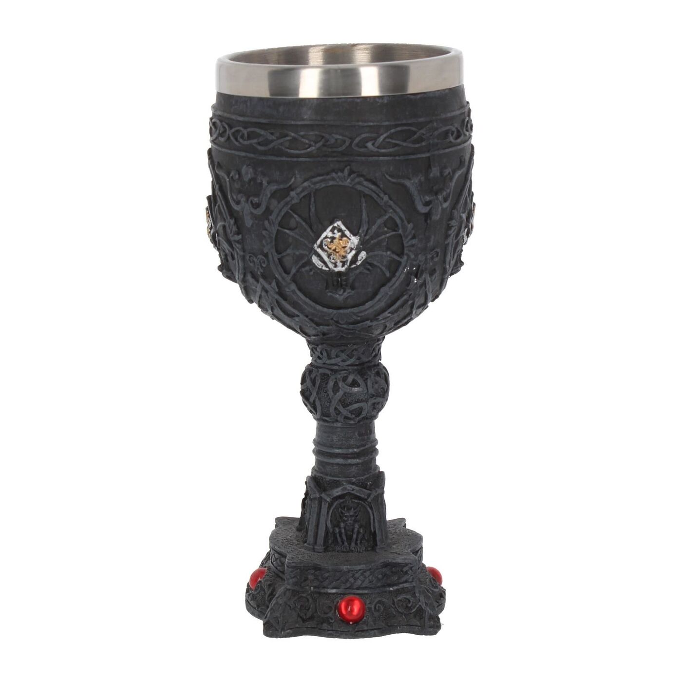 Этот кубок был создан талантливыми дизайнерами бренда Nemesis Now. Ножка этого кубка украшена различными узорами, опираясь на них, корпус кубка украшен изображениями пауков на черном фоне.