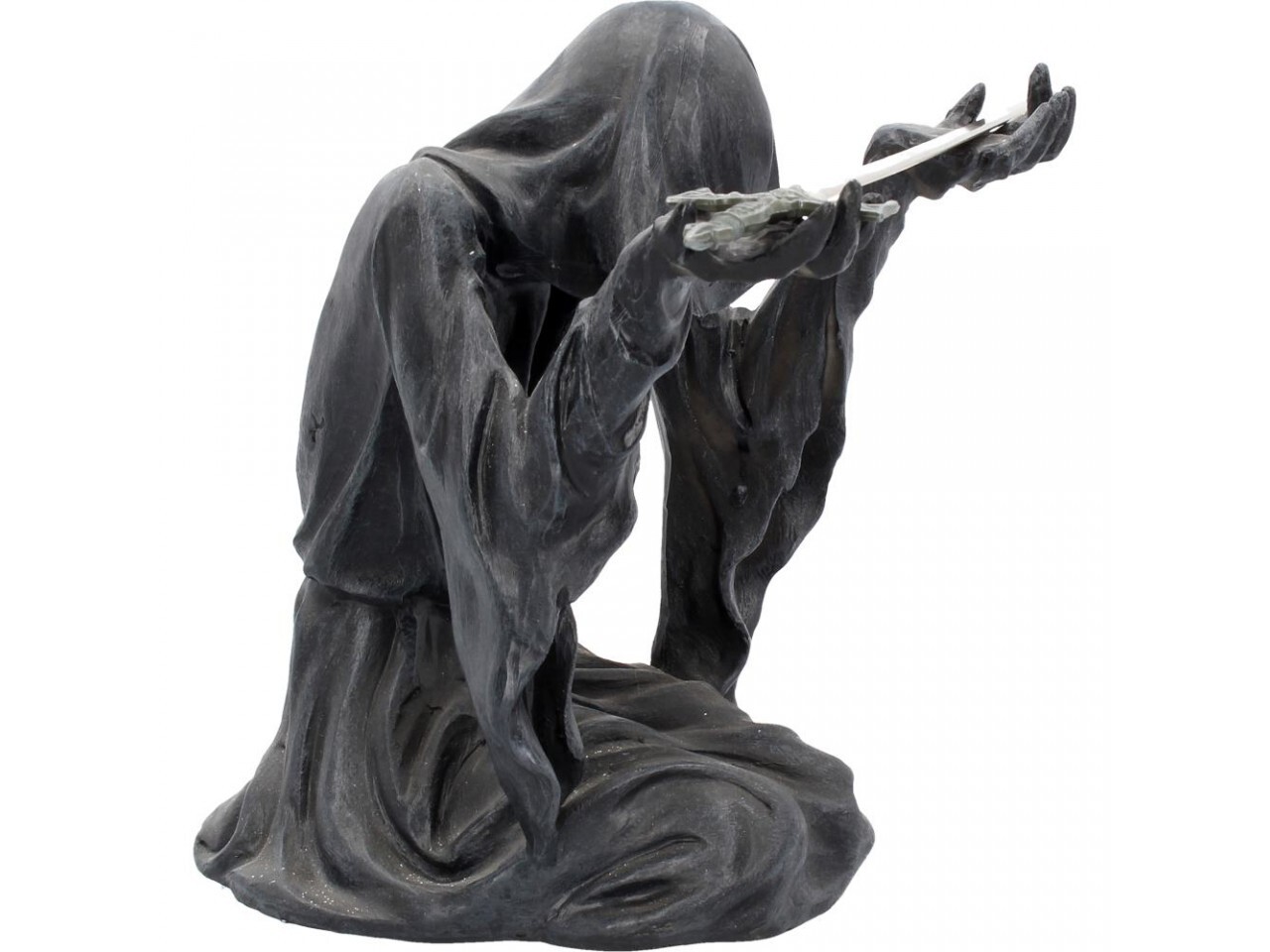 Этот темный Жнец покоится, преклонив колени, склонив голову, покрытую капюшоном, с поднятыми вверх в знак покорности руками. В его робкой руке - небольшой клинок, которым можно вскрыть самую ценную почту. Его черный плащ драпируется вниз, скрывая лицо, придавая этой фигурке зловещую ауру. Отлитая из тончайшего полистоуна и раскрашенная вручную, эта фигурка станет желанным дополнением любого готического дома или офиса. 20 см.