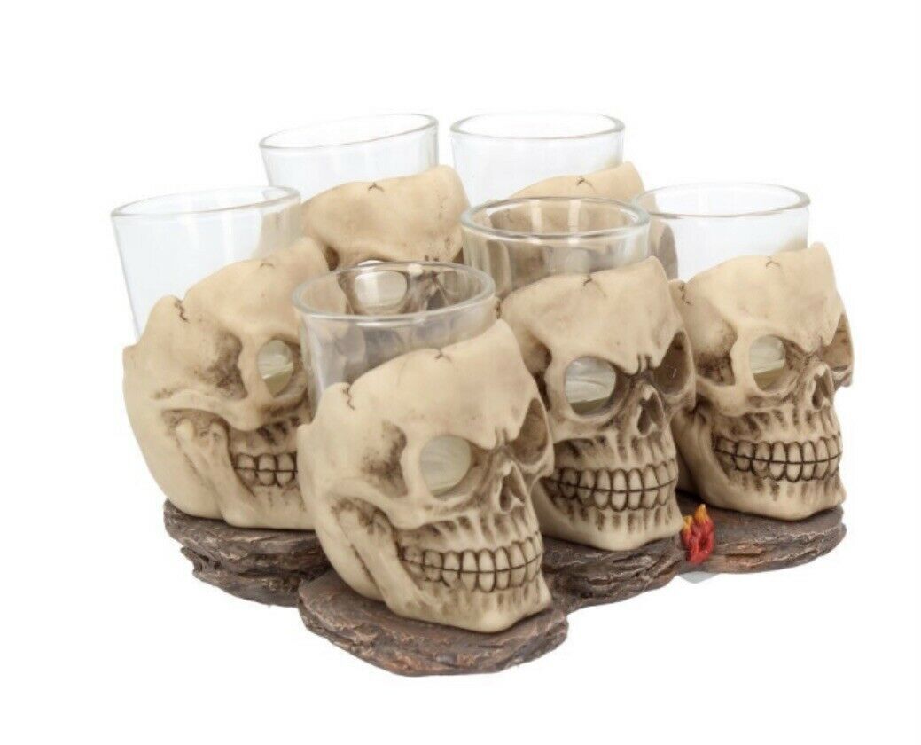 Выпейте с ушедшими в мир иной из одной из шести оригинальных стопок! На каменном основании стоят великолепные черепа, они смотрят из другого мира и зловеще усмехаются. Шесть рюмок ждут, пока вы попробуете на вкус вечность! Стопки отлиты из высококачественной смолы и искусно раскрашены вручную. Размер изделия 10 см вес 1,2кг