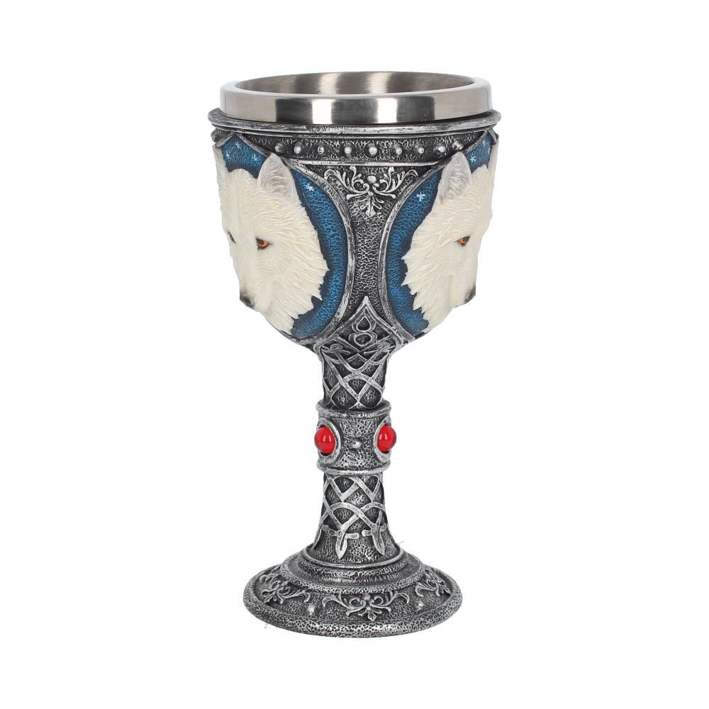Из коллекции подарочной посуды альтернативного бренда Nemesis Now этот кубок "Фантазийный волк" отлит из тончайшего полистоуна, а затем с любовью расписан вручную. Корпус этого кубка серебряный и покрыт повторяющимися узорами кельтских узлов, как и ножка, прерываемая красным драгоценным камнем, установленным на полпути вверх. Имитируя форму листьев, они напоминают местами окна готической церкви. По бокам узор прерывается большим синим овалом, в центре которого изображена большая белая волчья голова, смотрящая красными глазами и обладающая сверхъестественной мудростью. Этот кубок со съемной вставкой из нержавеющей стали, облегчающей чистку, идеально подходит для тех, кто чувствует зов дикой природы. Предназначен для использования по прямому назначению, а так же в декоративных целях. Мыть только вручную. Объем бокала - 200 мл. 19 см.