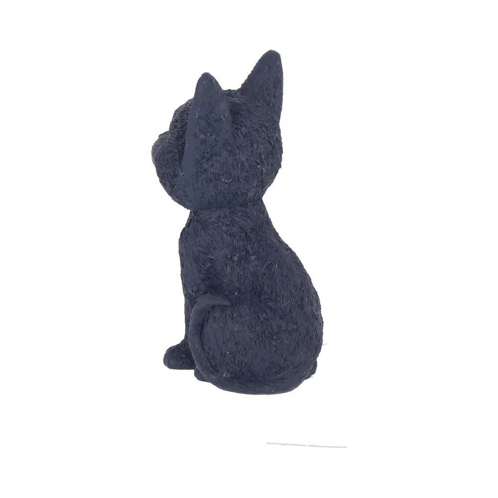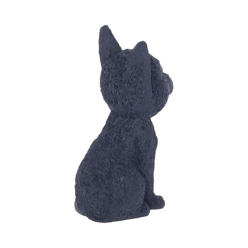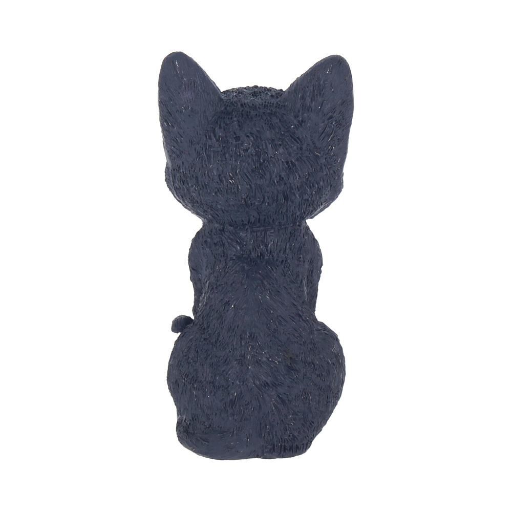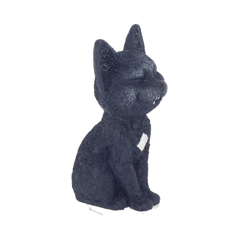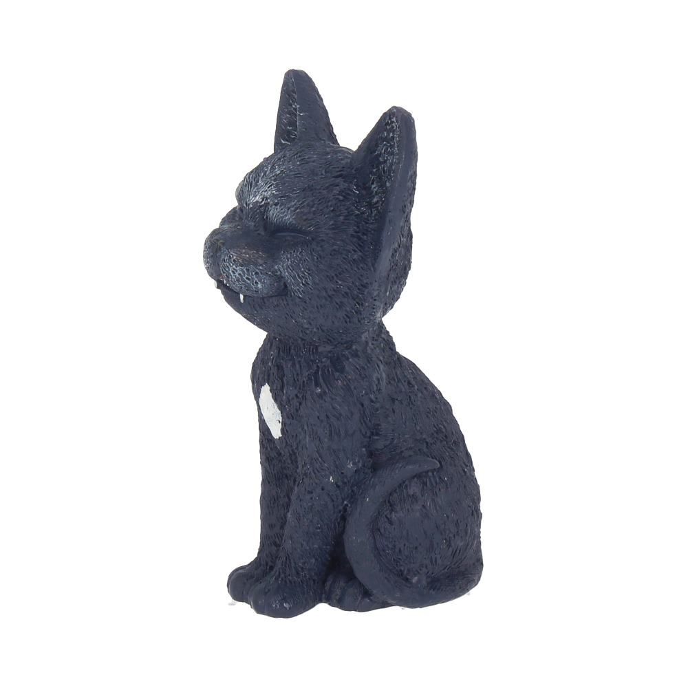 Отлитый из тончайшей смолы и раскрашенный вручную, этот маленький черный кот широко улыбается! Сидя на задних лапах, его хвост загибается на левую сторону. Под его верхней губой видна пара маленьких вампирских клыков.