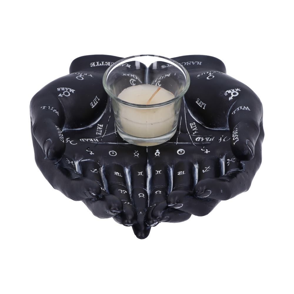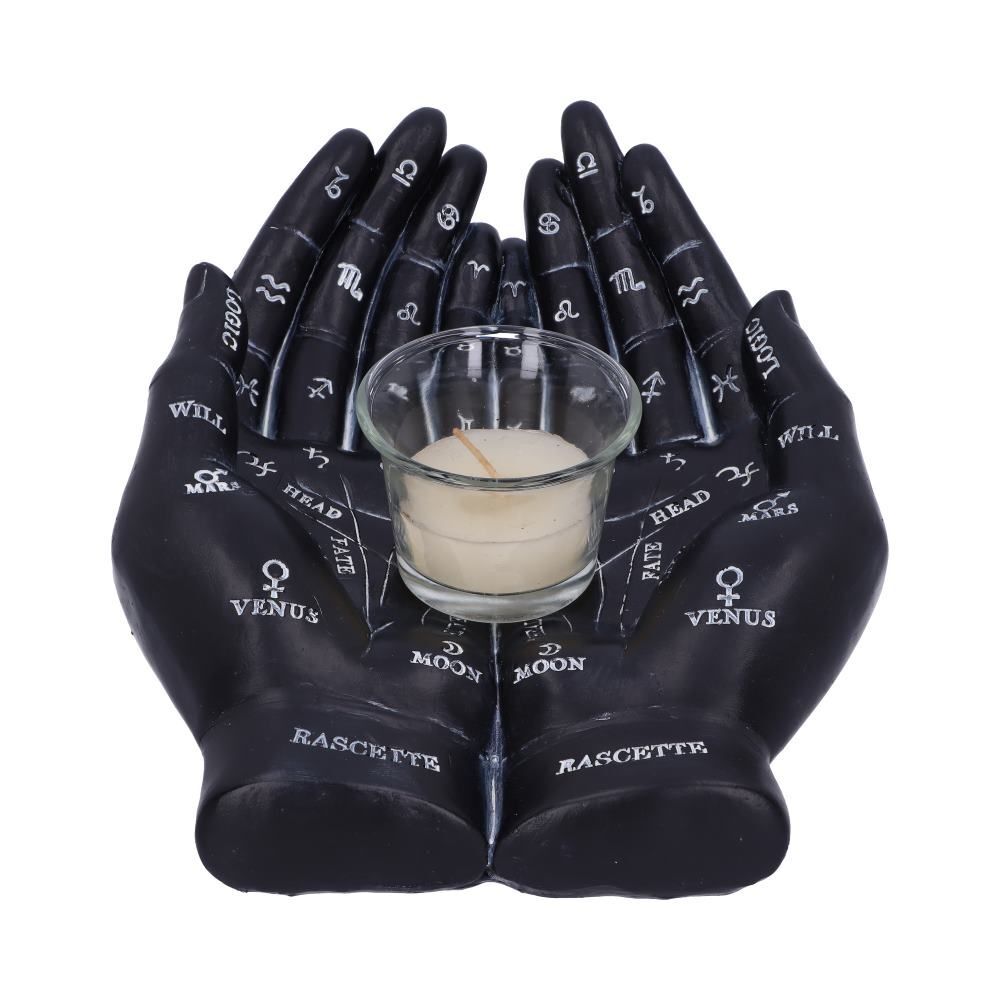 Древнее искусство пальметрии развивалось на территории древней Евразии. Пальметрия, иначе известная как хиромантия, - это утверждение о характеристике и предсказании будущего посредством изучения ладони. Считается, что, оценивая формы и линии на руке человека, можно оценить его характер и будущую жизнь. Отлитая из тончайшей смолы и тщательно раскрашенная вручную, эта пара черных фарфоровых рук лежит ровно, держа небольшой стеклянный подсвечник, и идеально подходит для любого начинающего гадателя по ладони.