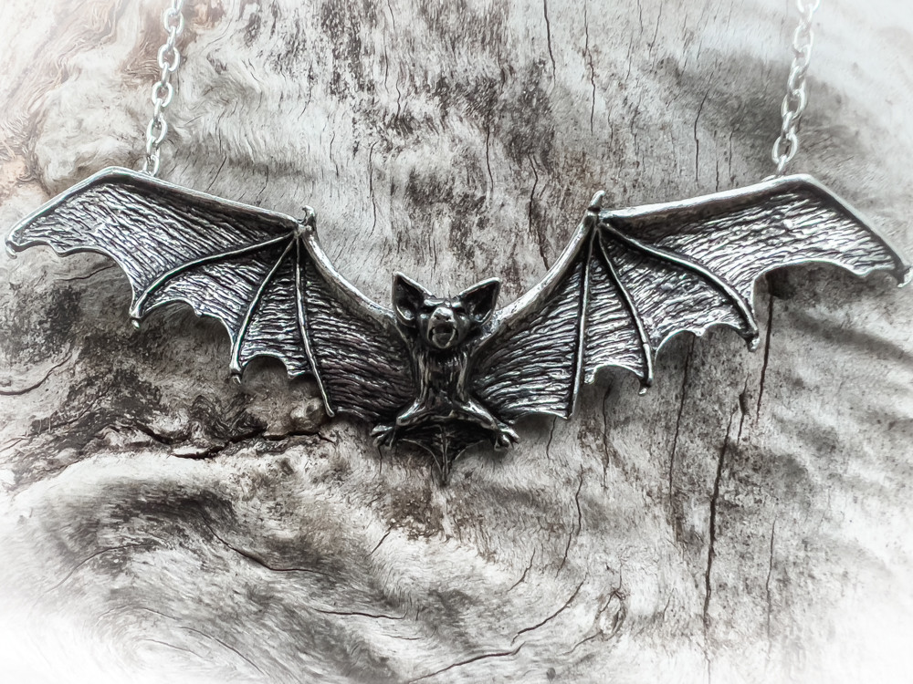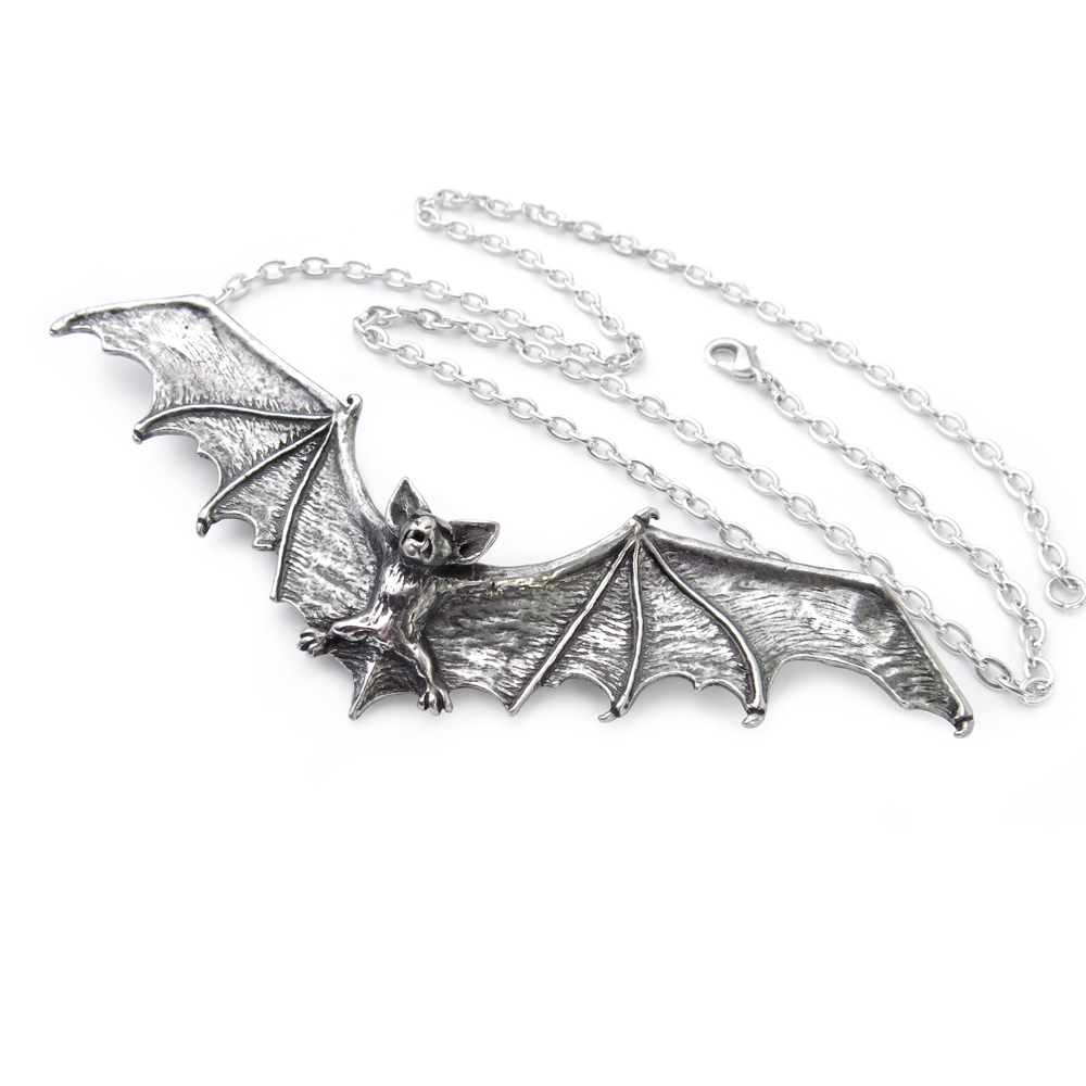 Ожерелье "Готическая летучая мышь" - это квинтэссенция готической тьмы и истинного существа ночи, застывшего в полете. Это классический аксессуар, выполненный из английского пьютера, с распахнутыми крыльями летучей мыши.