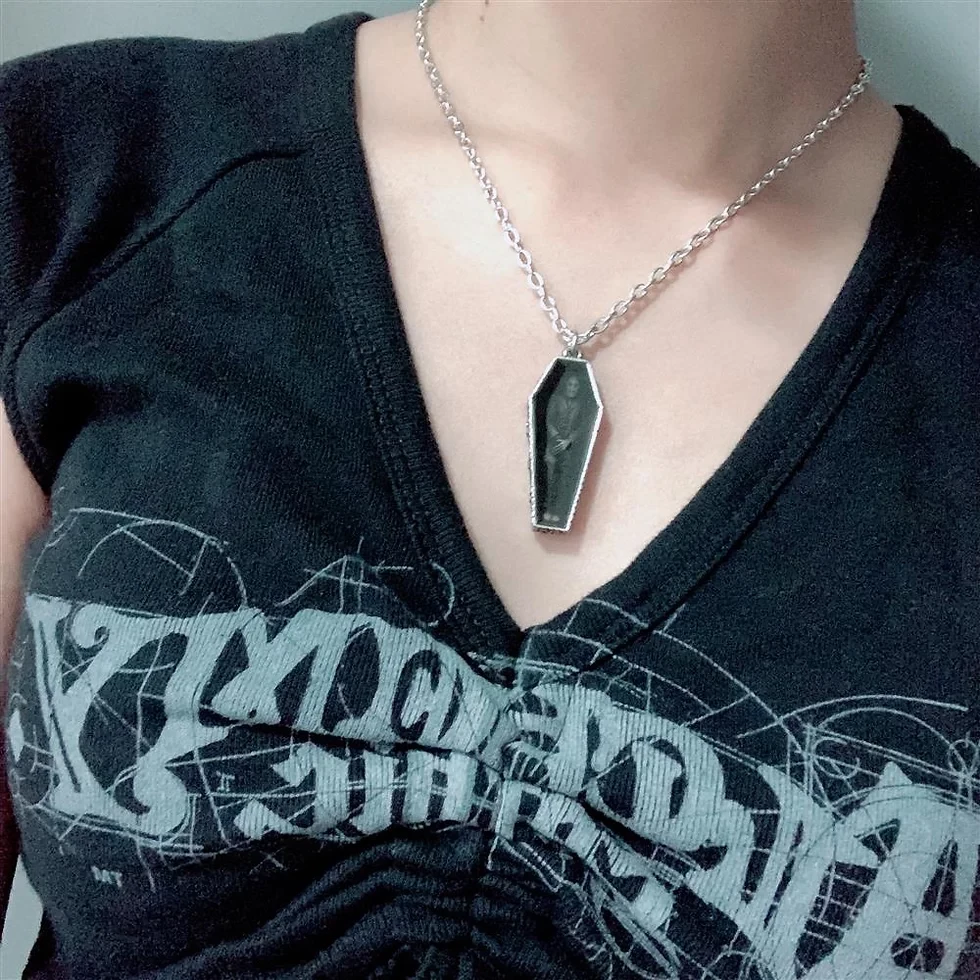 Подвеска выполнена в виде застекленного гроба с изображением мрачной фигуры Носферату. Это незабываемый призрак ужасного графа Мурнау Орлока, который всем своим видом передает атмосферу готического ужаса.
