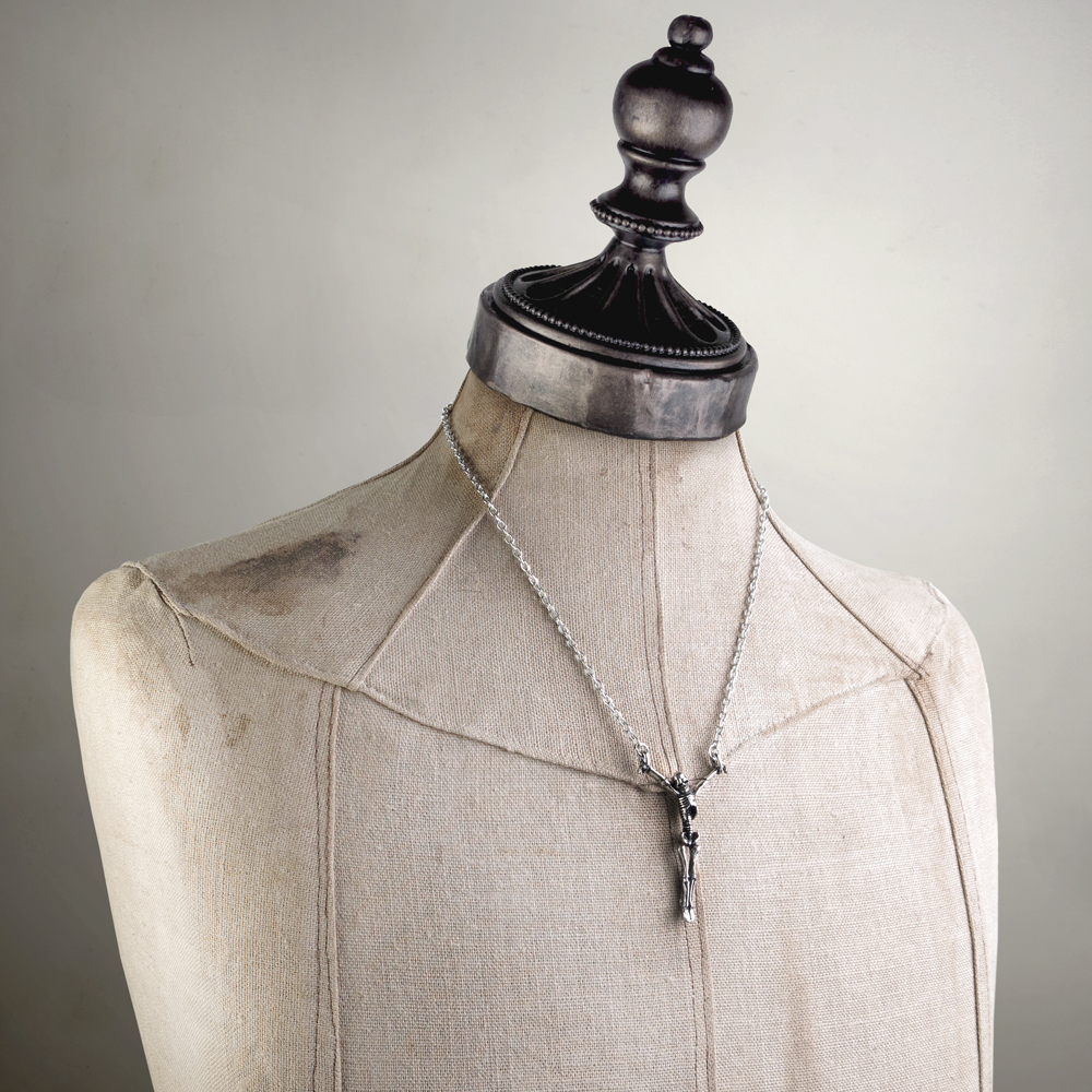 Дизайн ожерелья выполнен в классическом стиле, с использованием мрачного металлического декора. Жалкие истерзанные останки несчастного неизвестного когда-то человека, а ныне скелета, безжалостно подвешены на цепях. Полированный кулон из английского пьютера в форме скелета, подвешенного на раздвоенной цепи, придает изделию особую выразительность.