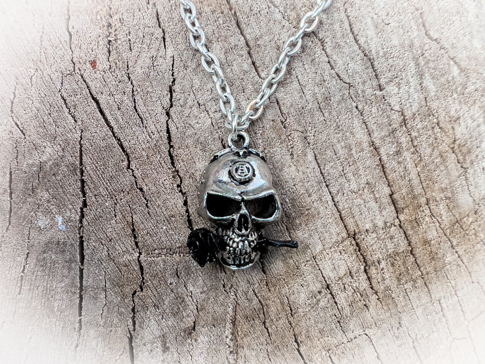 Портрет мудрости, силы и таинственного мастерства, классический череп великого философа. Вечная классика с изображением самого Алхимика. Двухцветный кулон с черной розой. Вес и размеры (приблизительно): H: 28 мм (1,10 дюйма) W: 22 мм (0,87 дюйма) D: 12 мм (0,47 дюйма) Вес 17 г (0,60 унции)