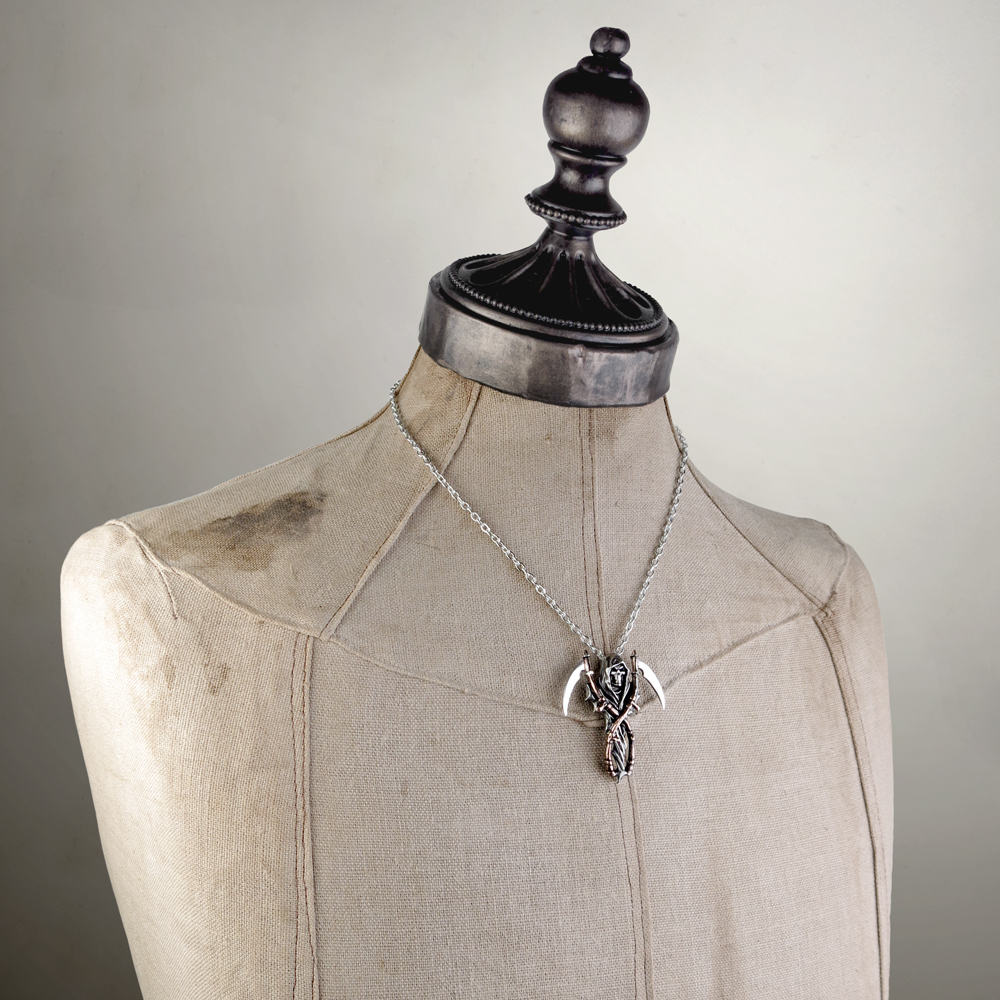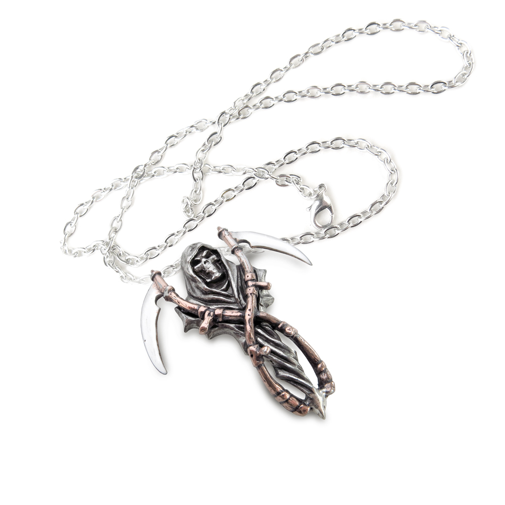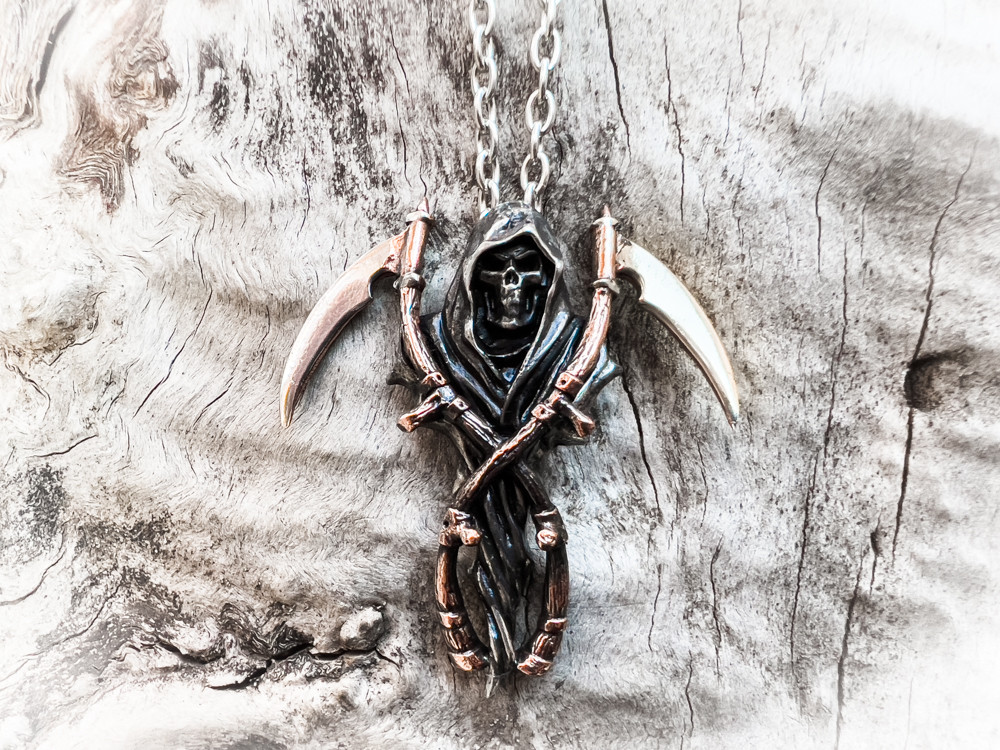 Подвеска выполнена в двухцветном дизайне с изображением Мрачного Жнеца и бронзовыми рукоятками косы. Это герб ангела смерти, жатвы скорби и высший знак судьбы.