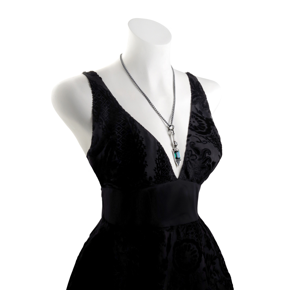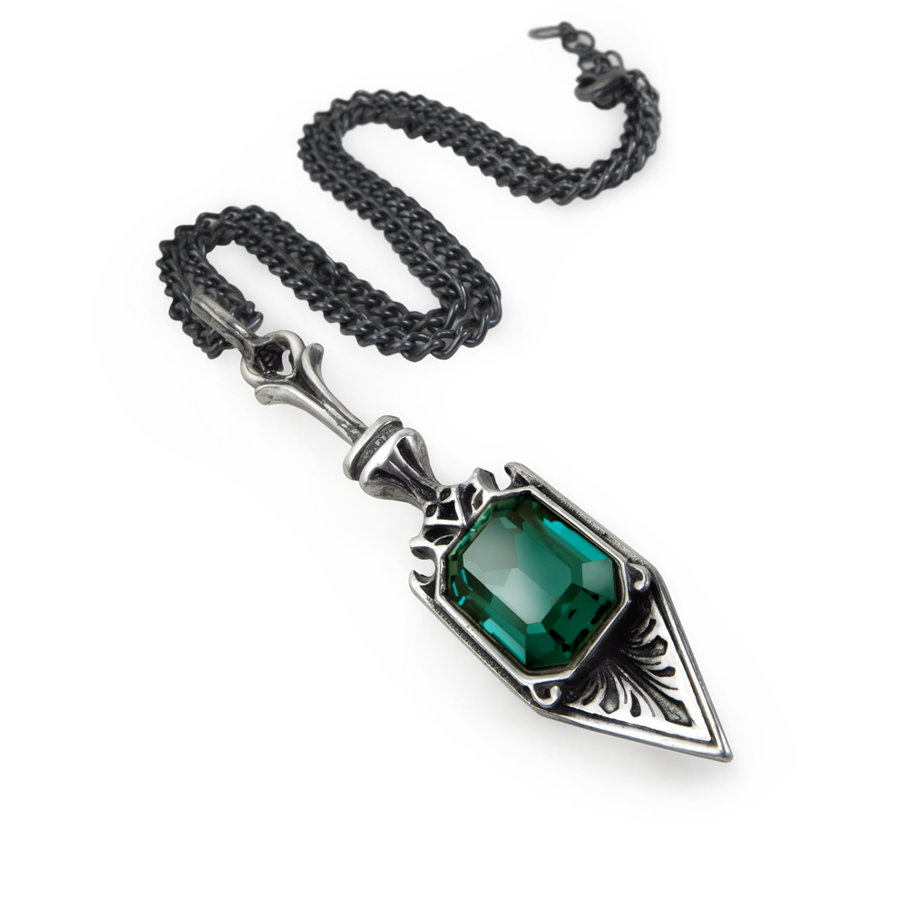 Подвеска выполнена в готическом стиле и украшена большим изумрудно-зеленым кристаллом Swarovski, что придает ей особый шарм. Этот аксессуар навеян формой классической ложки для абсента и символизирует гедонистическое наслаждение и возвышенную эстетику.