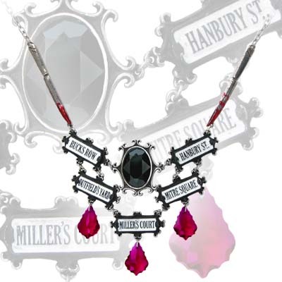 Ожерелье украшено окровавленным ножом, предположительно принадлежавшим злодею, и уличными указателями пяти мест преступления. Капли крови выполнены из красного хрусталя, а траурный камень Swarovski придает изделию особый шарм.