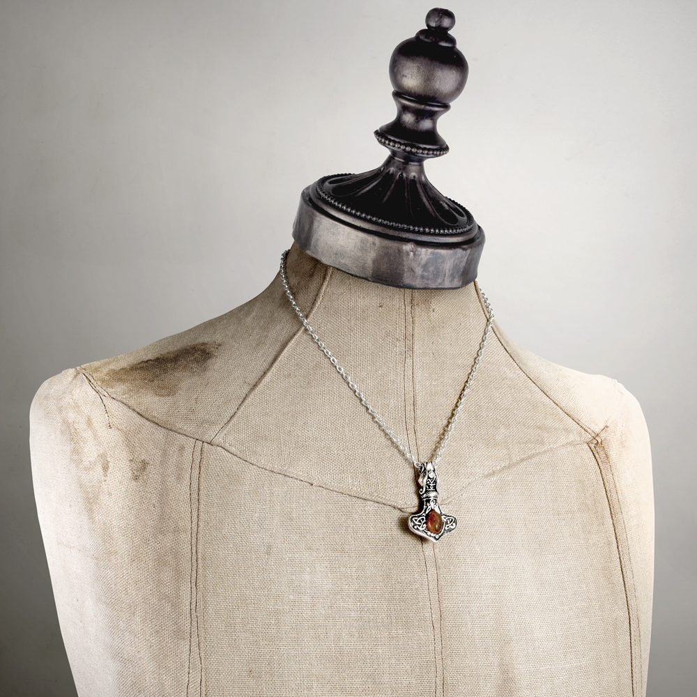 Подвеска выполнена в форме молота Тора, украшенного головой дракона и янтарем. Это классический, вычурный и очень сложный амулет, подходящий для высокопоставленного викинга лидера или военачальника. Голова дракона кусает цепь, а кельтский молот украшен полупрозрачным янтарем, что придает ему еще больше ценности.