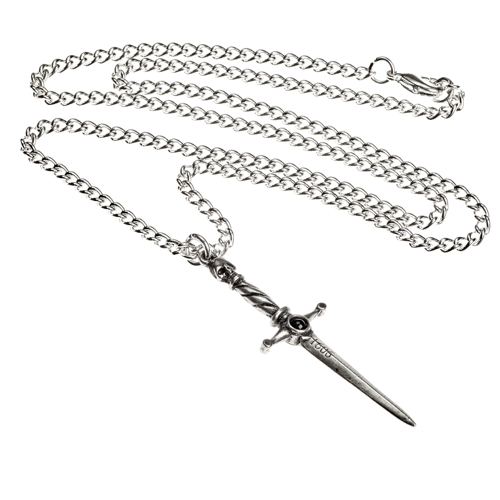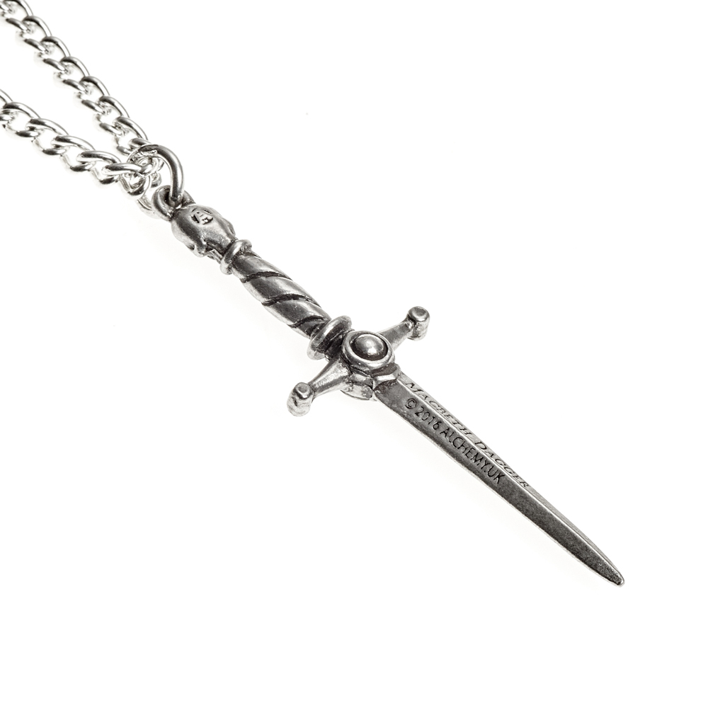 Остерегайтесь соблазна абсолютной власти - мегаломания приведет к вашему собственному падению. На клинке выгравировано "1606", год, когда Шекспир написал "Макбета", кровавая трагедия храброго шотландского лидера, движимого безжалостным стремлением к рецидивам, убийствам и тирании. Небольшой кулон в форме кинжала в стиле позднего средневековья с маленьким черным кабошоном на эфесе и гравировкой на лезвии. На цепочке 21"/48 см. Вес и размеры (приблизительно): H: 54 мм (2,13 дюйма) W: 17 мм (0,67 дюйма) D: 5 мм (0,20 дюйма) Вес: 14 г (0,49 унции)