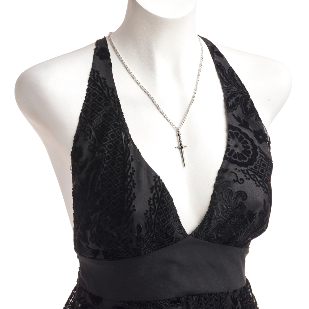 Подвеска Длань Макбета - это уникальное украшение, созданное в стиле готики. Оно выполнено в виде кулона в форме кинжала с гравировкой на лезвии и маленьким черным кабошоном на эфесе. Подвеска выполнена в серебристом цвете, что придает ей утонченный и стильный вид.